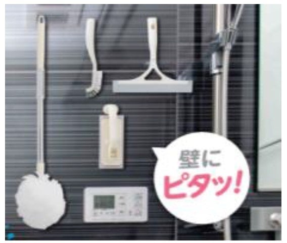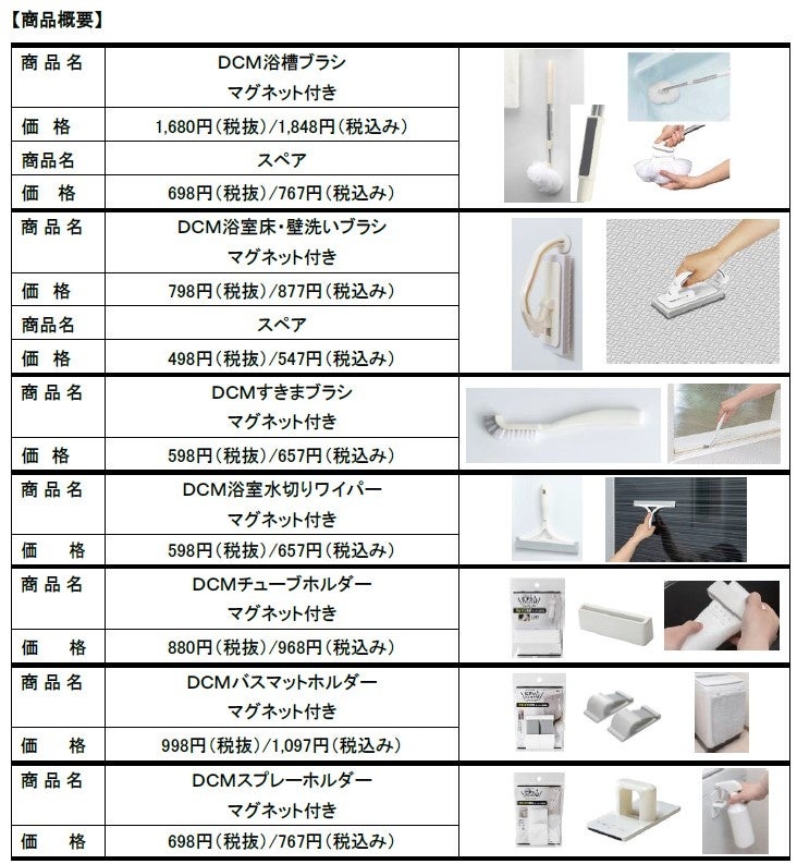 浴室の清掃で使用した清掃用品 は、 濡れたまま床面に置いておくとカビや汚れの原因になるため、ユーザーから 収納方法や収納場所に困っているとの声がありました。そこで、今回DCMは、壁に設置したフックや床置きラックを使用せず、マグネットでシステムバスの壁などに貼り付け収納できる清掃用品・収納用品を発売します。水切れが良くなり、カビや汚れを防ぐ効果が期待できます。