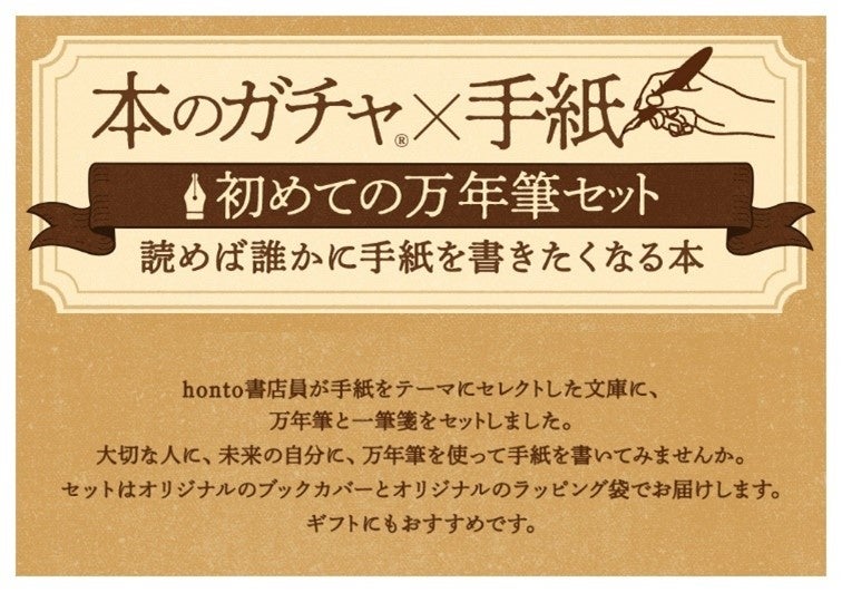 このたび「Fonte」が採用された「本のガチャ®×手紙 初めての万年筆セット」は、honto書店員が約6万タイトルの文庫から「手紙」をテーマに選書し、万年筆とインクと一筆箋(もしくはレターセット)をセットにした商品です。文庫は「手紙」をイメージしたhontoオリジナルデザインの紙製ブックカバーで包まれ、表紙を開くまで中身が分からない状態でお届けします。
