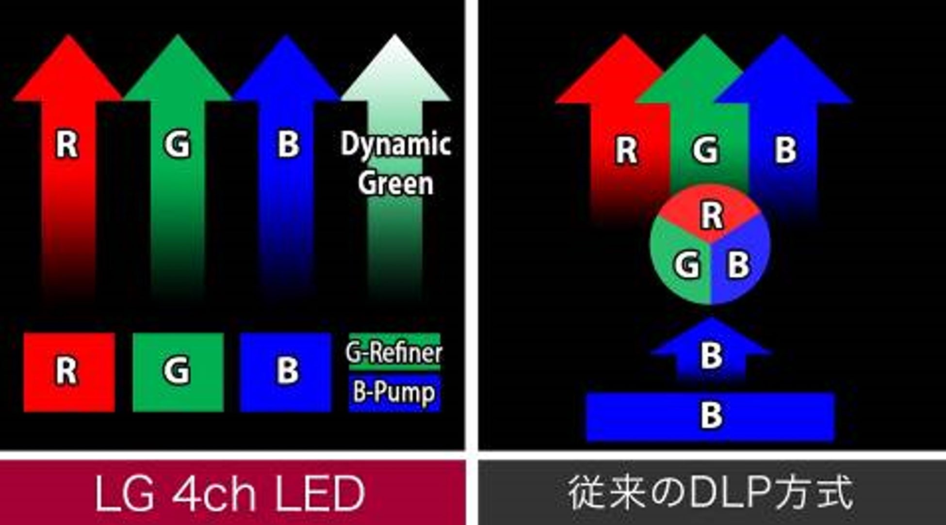 プロジェクターの投影方式の中でも、「黒」の再現性が高く、高コントラストなDLP方式を採用しています。また、RGBとダイナミックグリーンの計4つのLED光源によって、鮮明かつ豊かな原色を表示。従来のDLP方式のプロジェクターの弱点であった経年的な色の変色やレインボーノイズを軽減することで、ピュアな色味を再現しました。