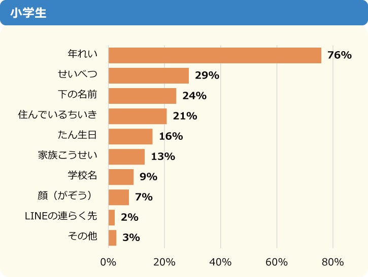 ネッ友に対して実際の自分とは違う年齢や性別などを伝えたことがあるかという質問には、「ある」と答えた小中学生は約3割いました。中でも「年齢」は、約7割の人が違う情報を伝えたことがあるようです。
