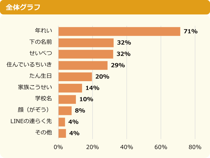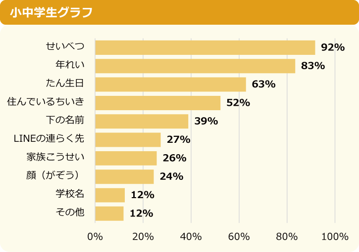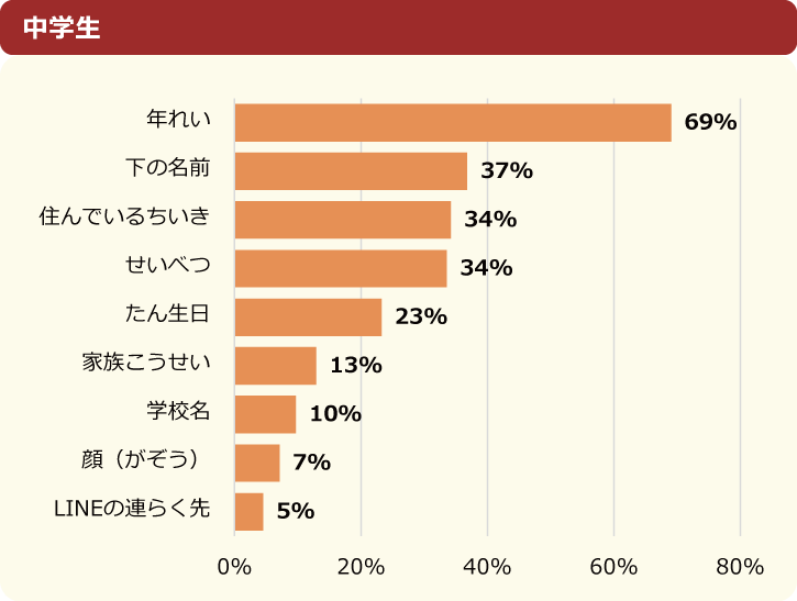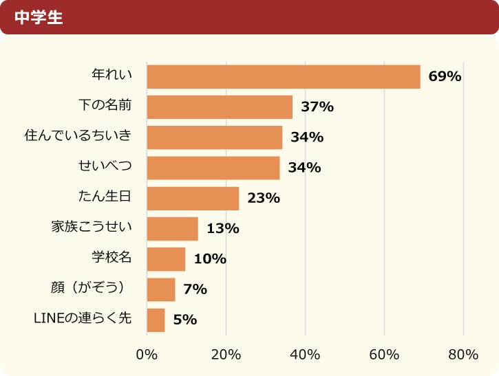実際とは違う情報を伝えたものとして「年齢」と答えた人が最も多く、全体の71%を占めました。「下の名前」「住んでいる地域」「性別」「誕生日」の割合を見てみると、中学生の方が小学生に比べてそれぞれ10%くらい増えていることがわかりました。中学生の方が違った情報を伝えている人が多いようです。