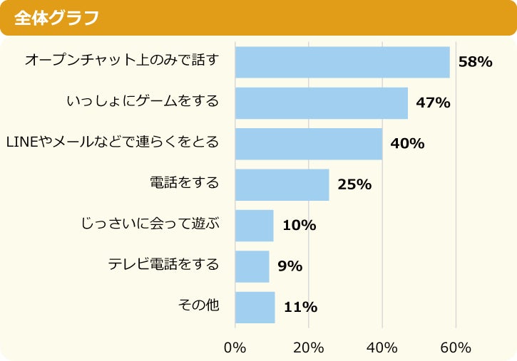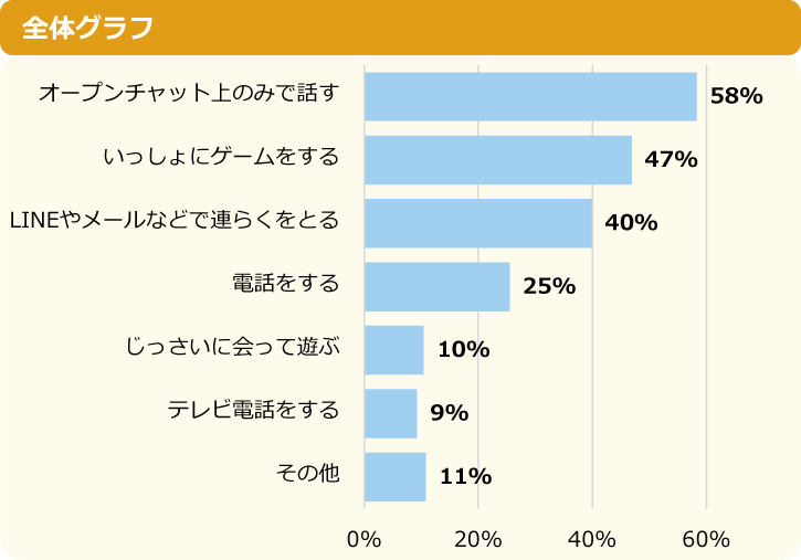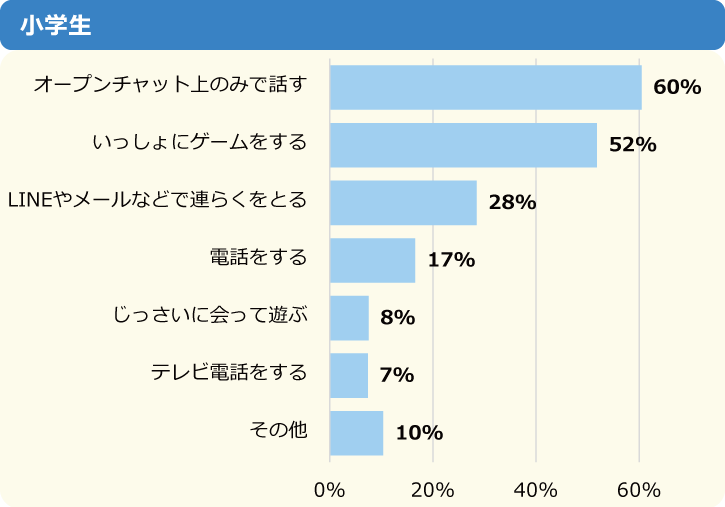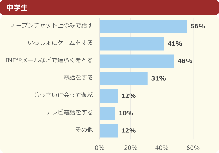 1位は「オープンチャット上のみで話す」でした。小学生と中学生で大きく違うのは、2位が小学生は「いっしょにゲームをする」だったのに対し、中学生は「LINEやメールなどで連絡をとる」がランクインしているところです。4位以下の「電話をする」や「実際に会って遊ぶ」も、小学生に比べると中学生の割合が増えました。