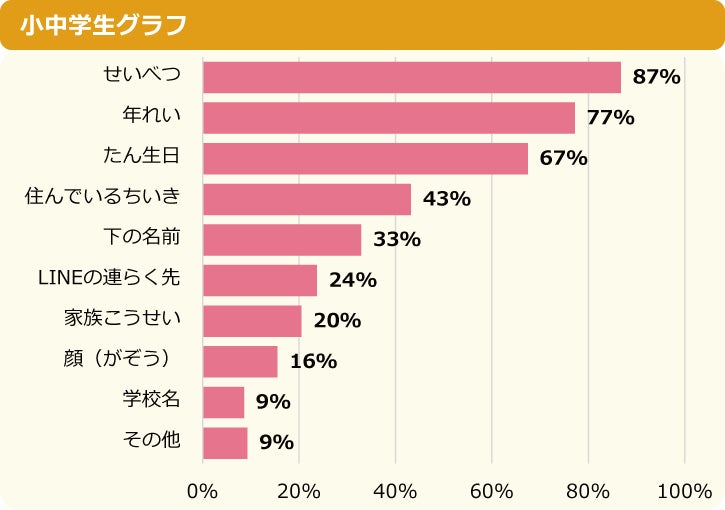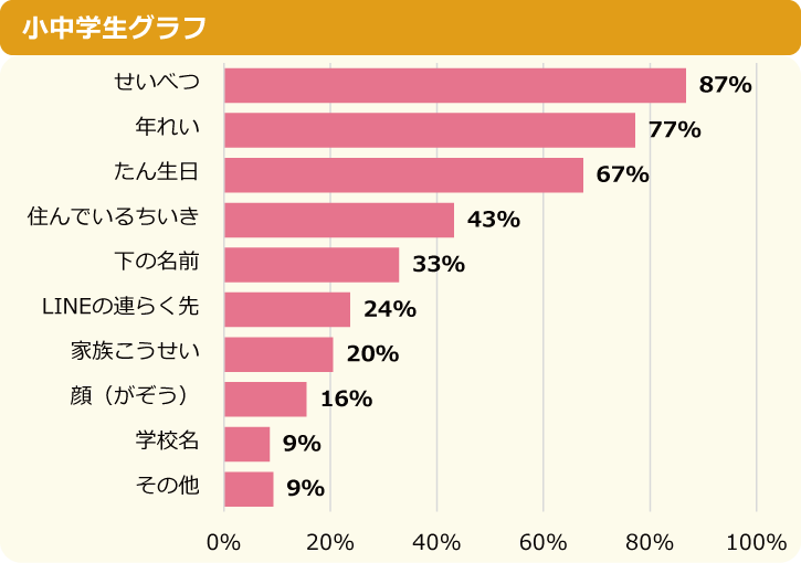 ネッ友に教えている自分の情報は「性別」という小中学生が87%で最も多く、続いて2位が「年齢」で77%、3位が「誕生日」で67%という順でした。ネッ友について知っている情報と同じように、自分の情報もネッ友に教えていることがわかります。