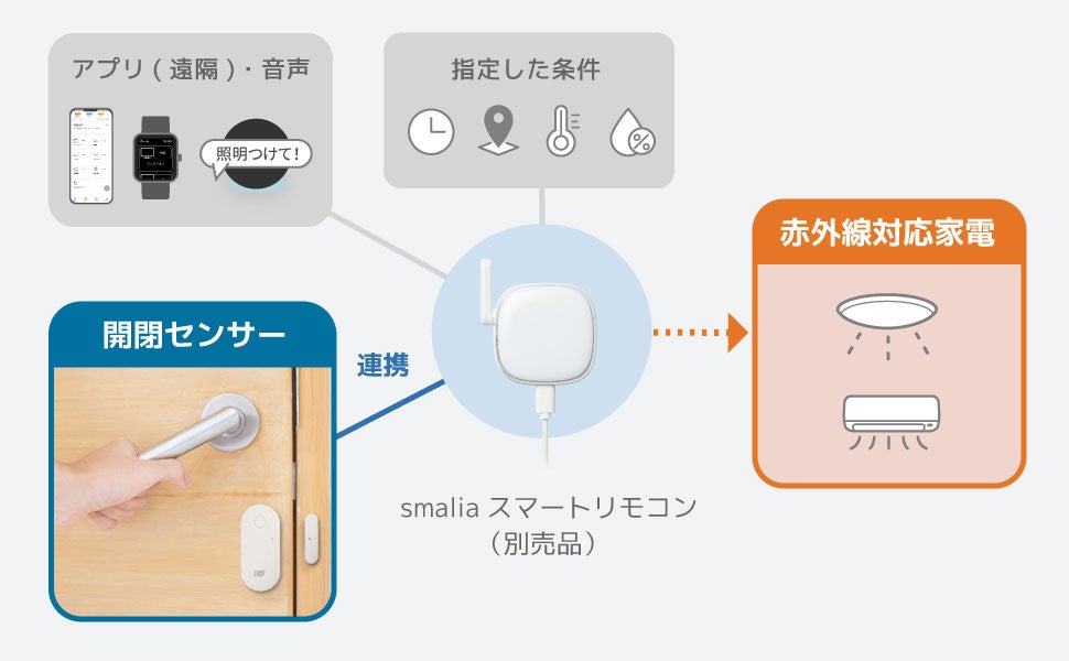 別売品「smaliaスマートリモコン」は、「スマホ」「スマートスピーカー」「温度、時間などの条件」を用いて家電が操作できる製品です。