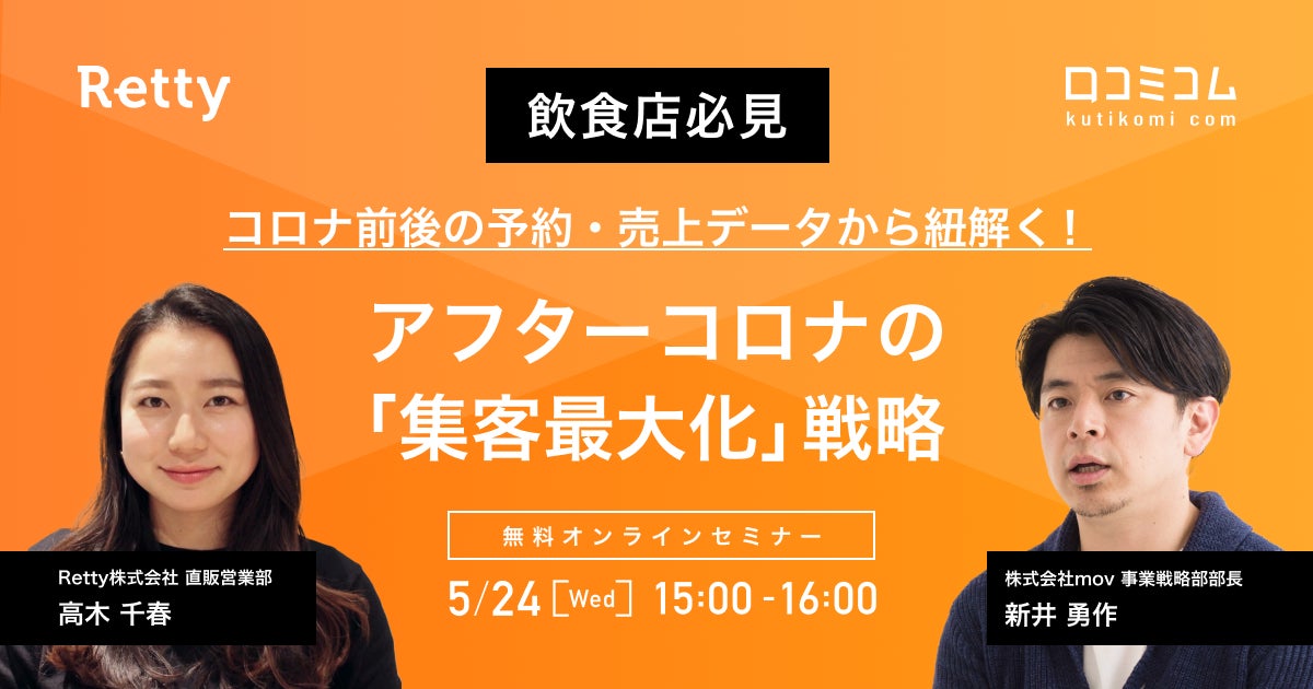 そこで本セミナーでは、グルメサイト「Retty」を運営するRetty株式会社と、口コミサイト一括管理ツール「口コミコム」を運営する株式会社movがそれぞれ持つ独自のデータをもとに、押さえておくべきWeb施策ノウハウをご紹介します。