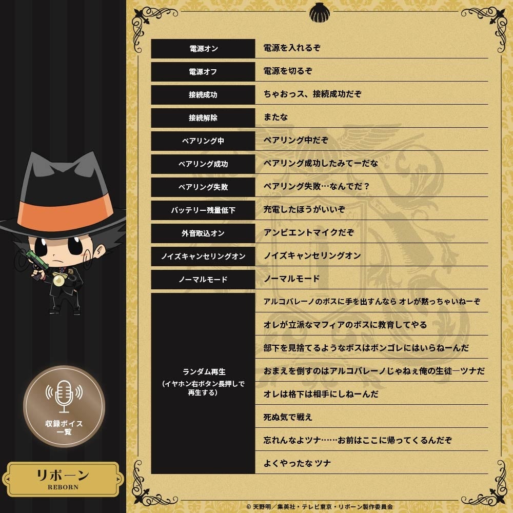 イヤホンの起動/終了や端末との接続状況をお知らせする「ボイスガイダンス」に加え、作中の印象的なセリフを聴くことができる「ランダムボイス」を、なんと完全新録で計150種類以上収録。ボンゴレファミリーの軌跡が耳元で甦ります。