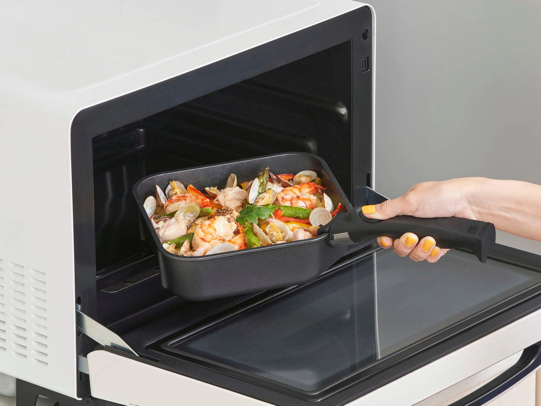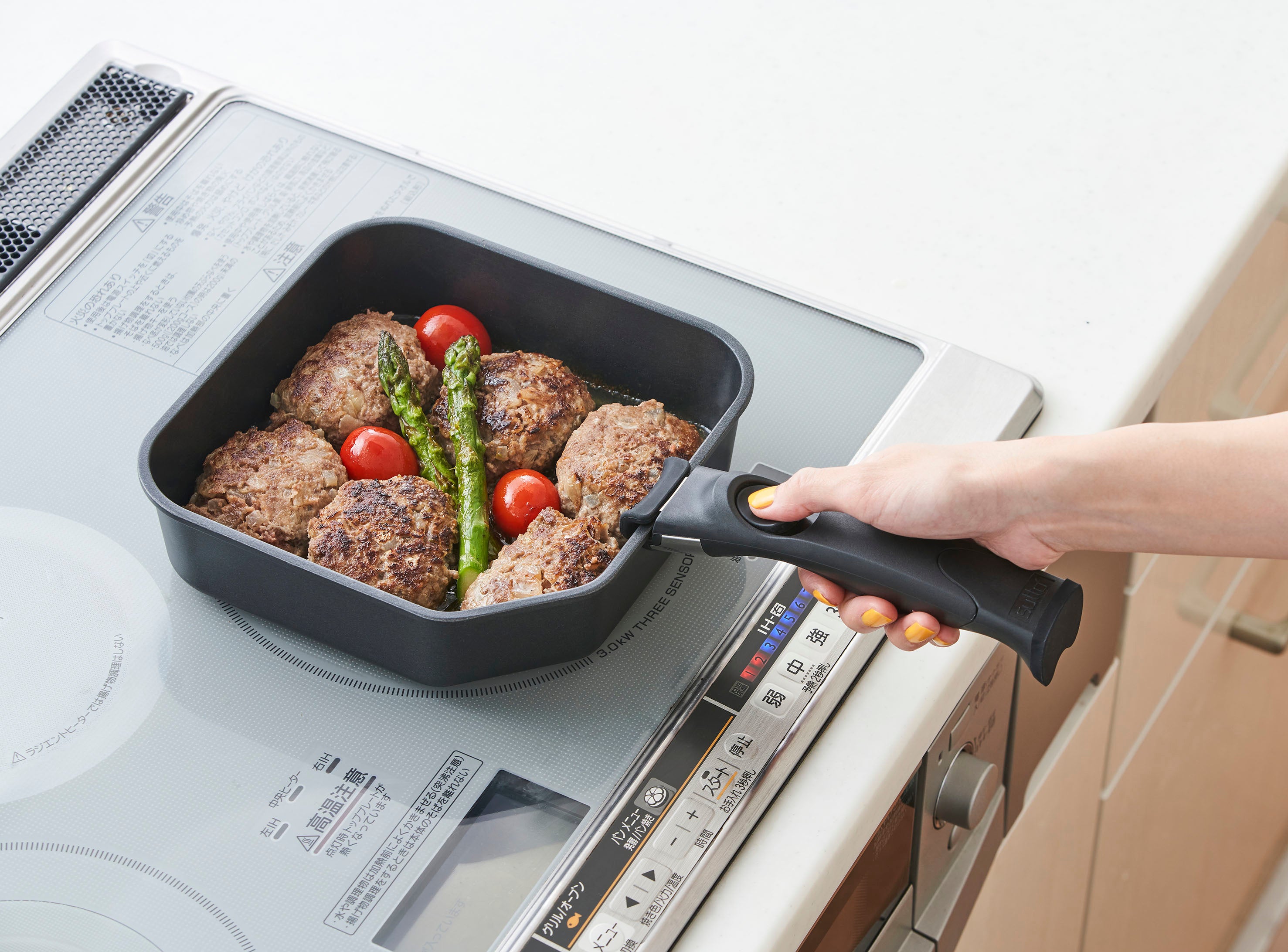 フライパン本体は、ハンドルを取り外してオーブン調理が可能です。オーブンを使用した調理の場合、設定温度は220度以下でご使用ください。
