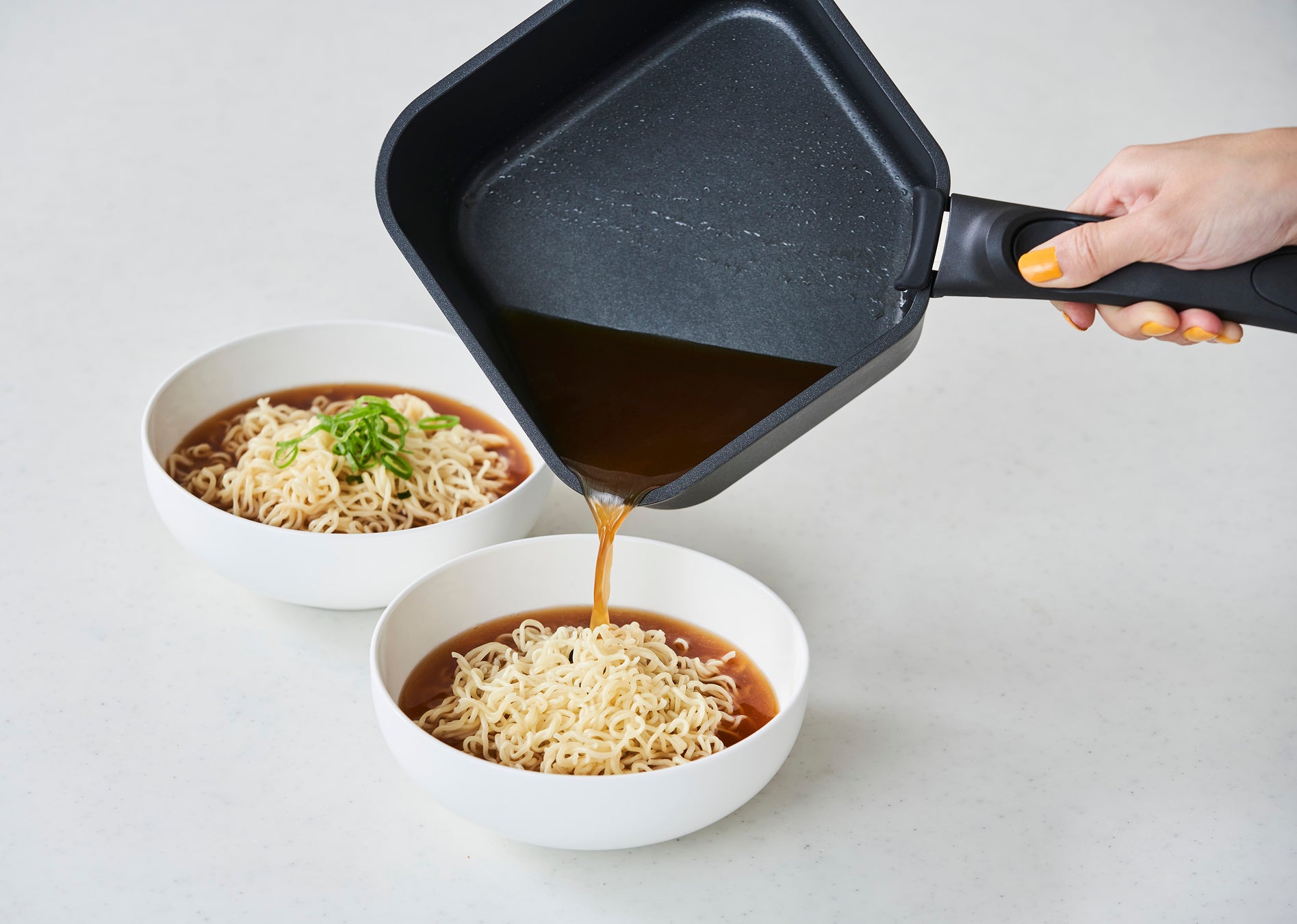 ハンドルを角に取り付けることで、フライパン本体の角が注ぎ口の役割となり、汁物を注ぎ入れたり、タレを回しかけたりと、盛り付け時に便利です。