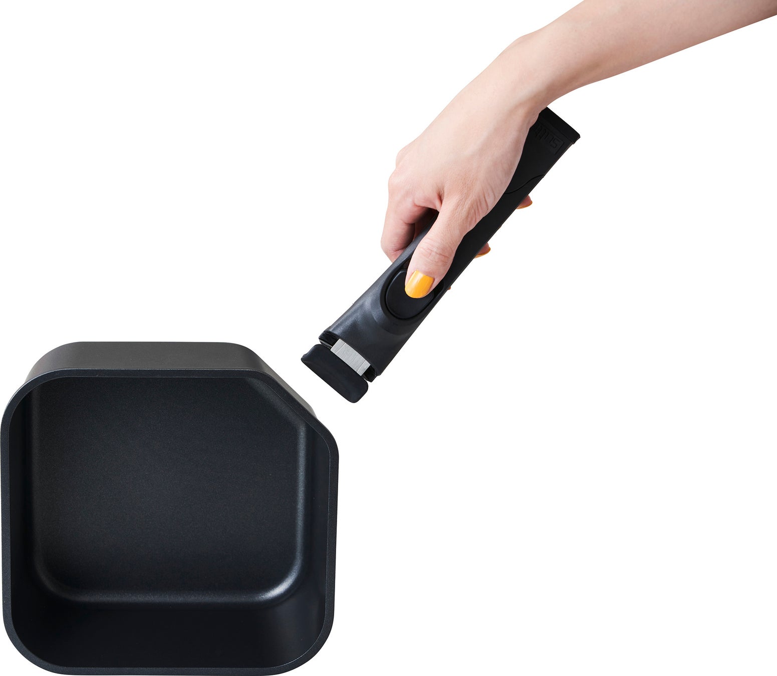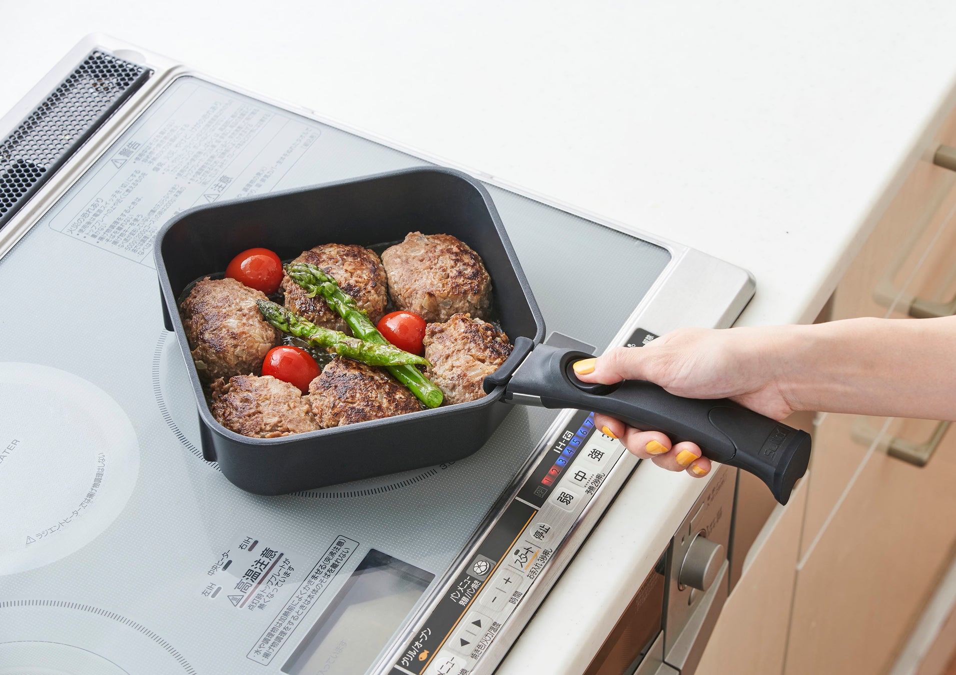 専用の着脱ハンドルはフライパンの直線部分に取り付けることができます。四角いフライパン本体の4つの辺と、角1か所が対応しているので、調理の際も卓上への持ち運びの際も、ハンドルの取り付け位置に迷わず便利です。