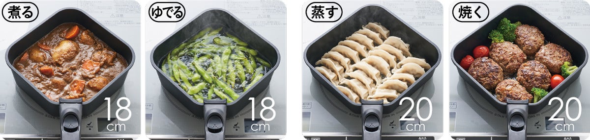 18cmのフライパンは深さが8cmあり、汁物や煮込み料理に便利です。20cmのフライパンは焼き面積が広く、焼き物に最適です。