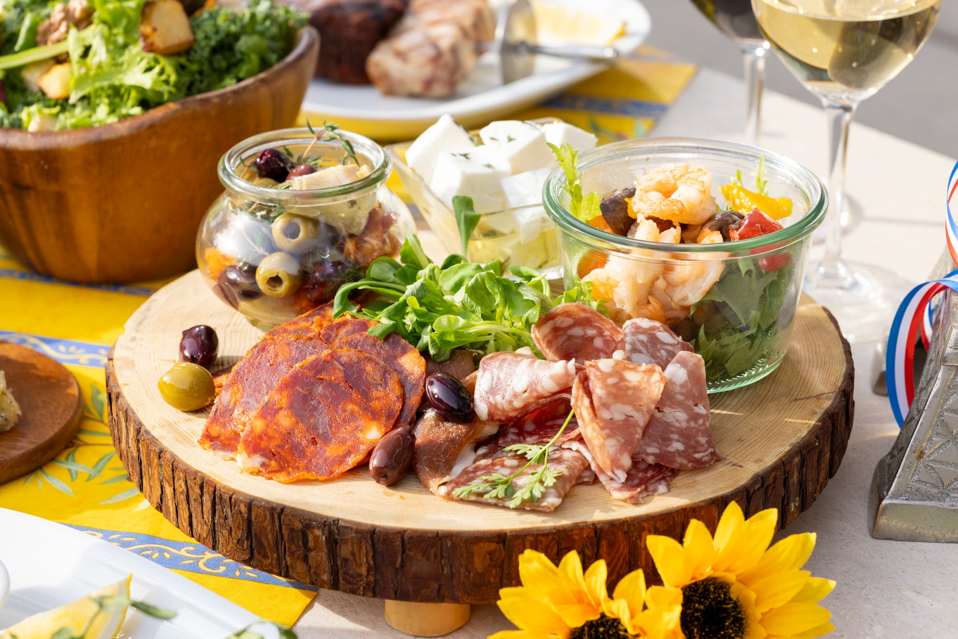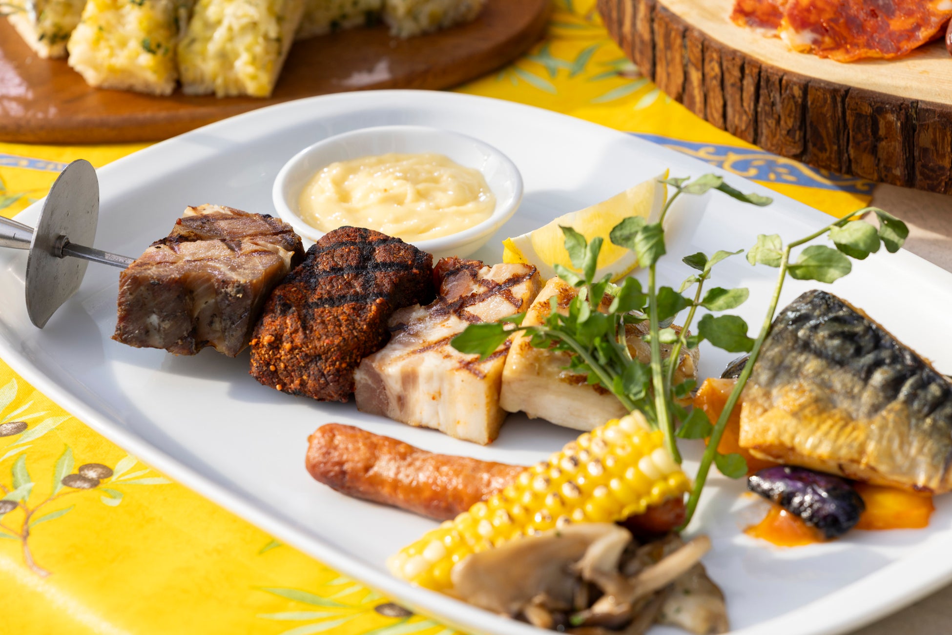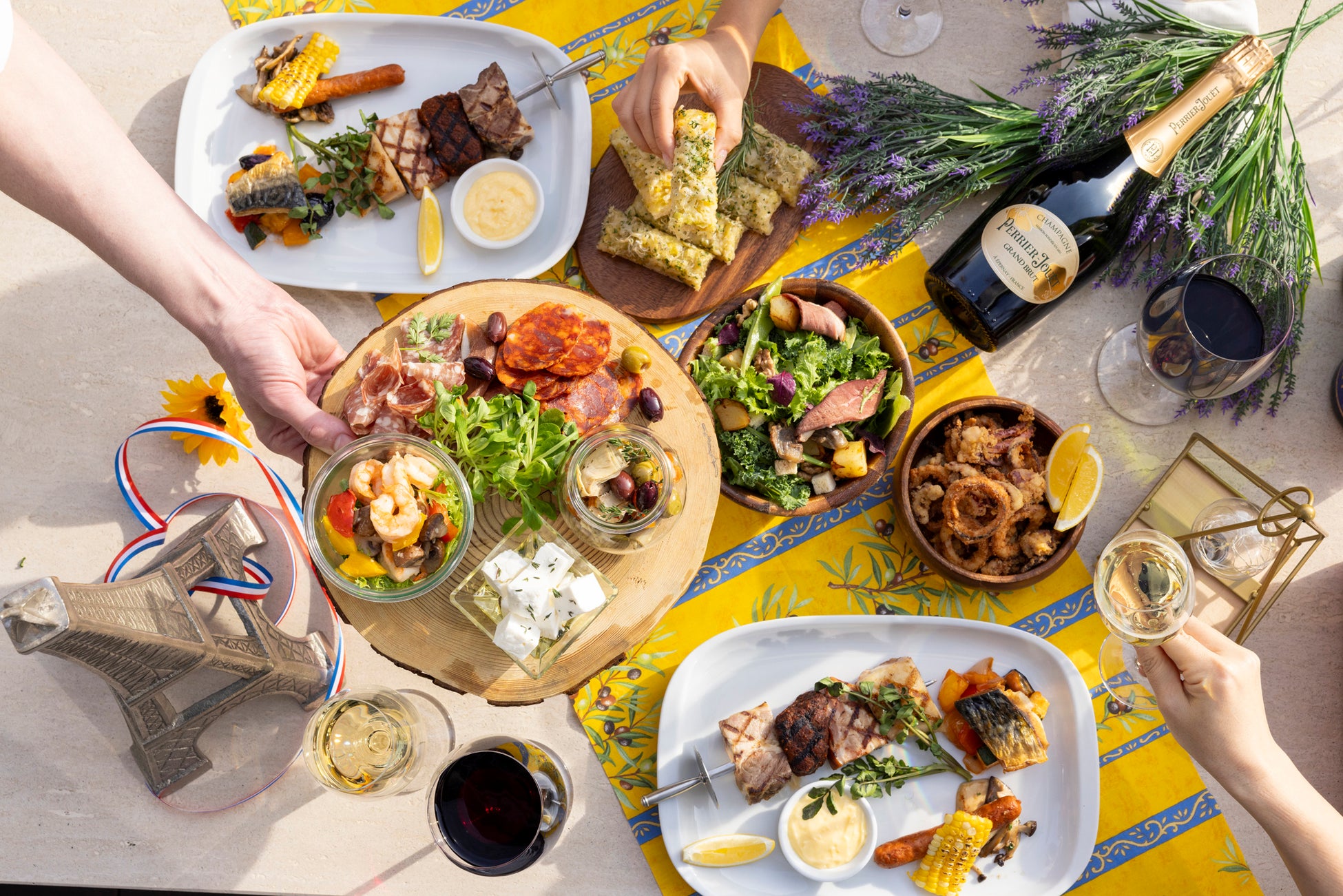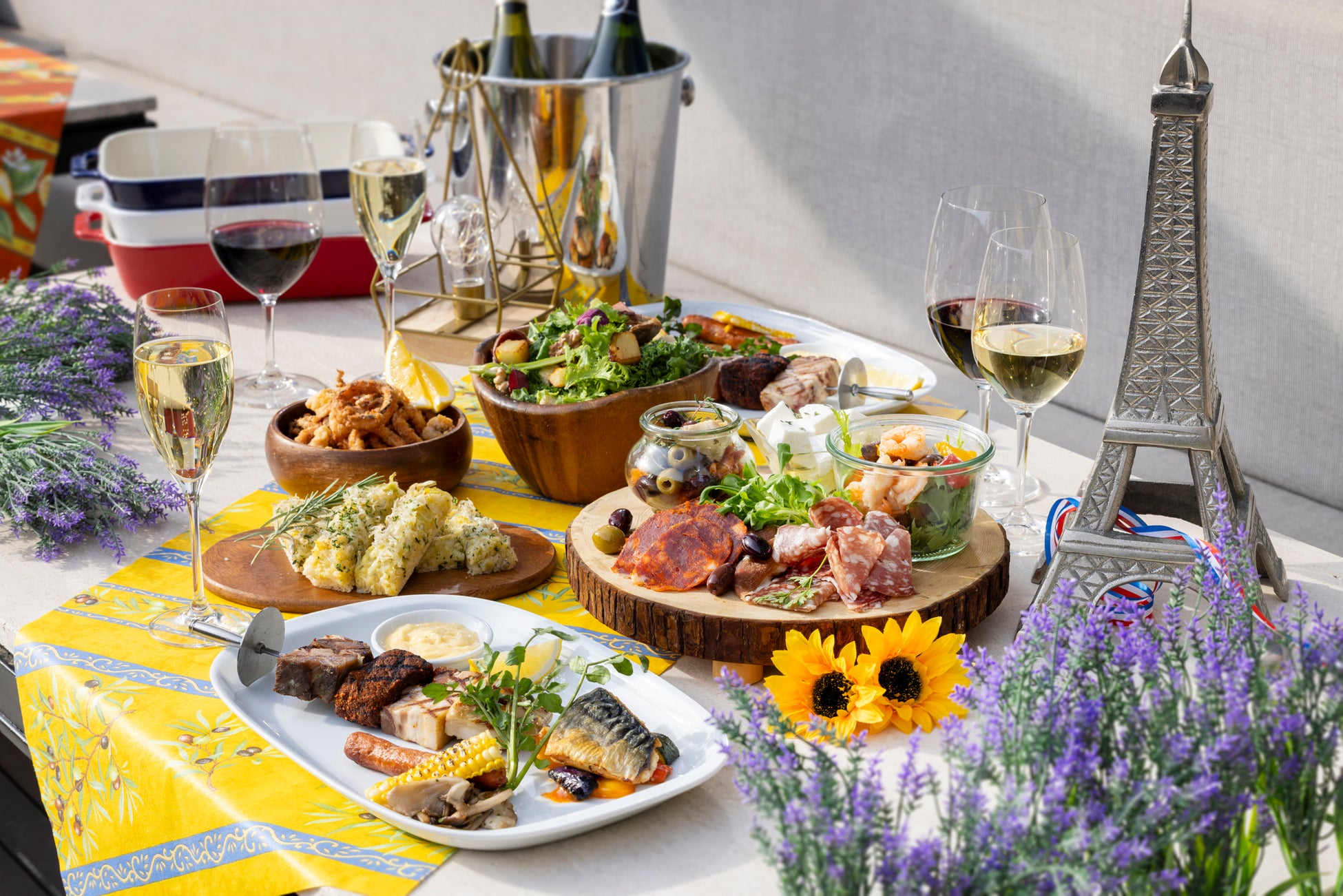 アミューズとしてご用意する、西洋葱にチーズやしらすを合わせたピサラディエール、サラミに生ハム、オリーブとアーティチョークのマリネ、フェタチーズ、そしてエビのアヒージョなど、山海の恵みをふんだんに使用した4種の前菜は、どれもシャンパンやワインによく合う味わいです。メインディッシュは、ビーフやポーク、チキン、ベーコンなど合計200グラムのボリューミーなグリルを、串に刺してご提供するブロシェットと呼ばれるフレンチスタイルのバーベキューに加え、ラム肉を合わせたスパイシーなメルゲーズソーセージやマッシュルームボルドレーズ、ラタトゥイユを付け合わせ、フランス各地に根付く豊かな食文化をお楽しみいただける内容です。