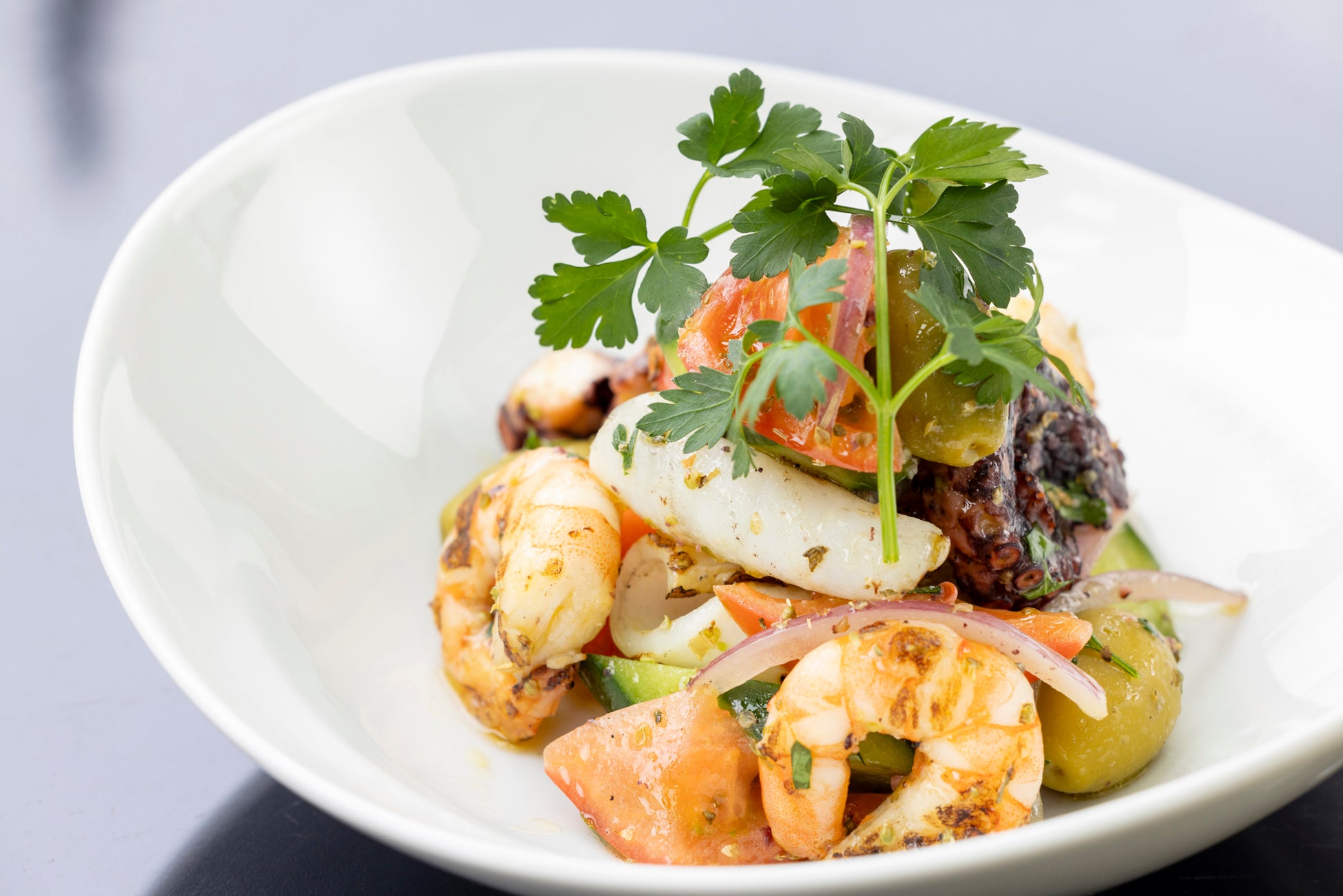 ヘルシーなギリシャ料理からヒントを得た、新鮮な魚介類や野菜をたっぷり使用した冷製アンティパストです。一度オーブンで火入れをした大ぶりのエビやタコに合わせるのは、フルーツトマトやきゅうりなどの夏野菜とシチリア産のオリーブ。マリネ液に加えた、オレガノなどのハーブの爽やかな香りが食欲をそそる一品です。冷たい白ワインとのペアリングもおすすめです。