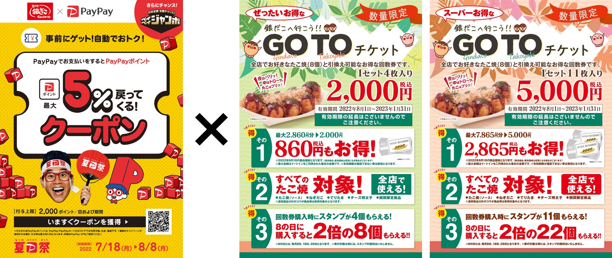 “ぜったいお得な” 『夏の回数券GOTOチケット』 は、「お好きなたこ焼(8個入り)」※1 と引換え可能な大変お得な回数券です。今年も、4枚セット(2,000円税込)、11枚セット(5,000円税込)の2種をご用意。