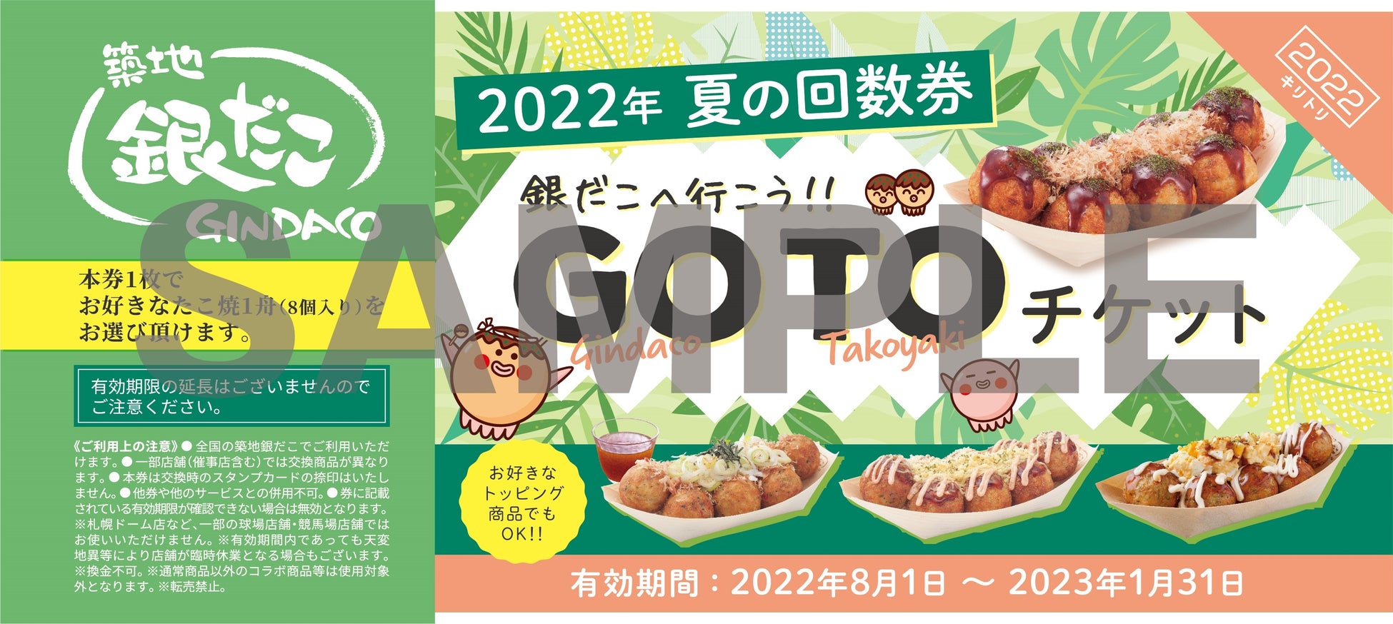 築地銀だこhttps://www.gindaco.com/を展開する株式会社ホットランドhttps://www.hotland.co.jp/(本社:東京都中央区、代表取締役社長:佐瀬守男)は、今年も2022年7月1日(金)から、全国の築地銀だこ店舗(一部店舗を除く)にて、“ぜったいお得な” 『夏の回数券GindacO TakOyakiチケット(略して、GO TO チケット)』を数量限定で発売いたします!