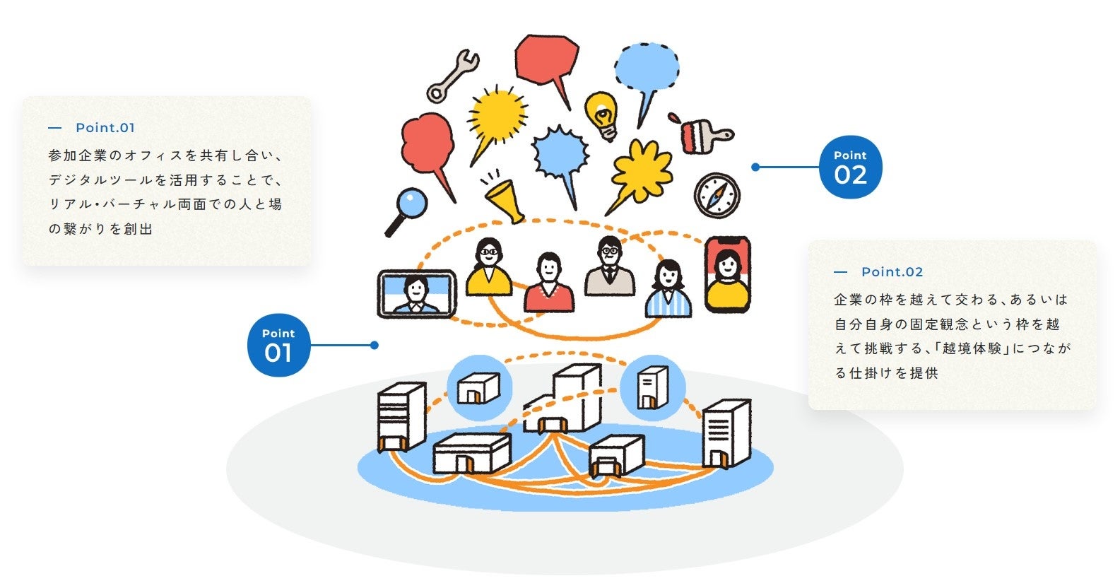 OpenWorkingでは、参加企業間で自社のオフィスの一部を共有し合い、デジタルツールを活用することで、リアルとバーチャル両面での「場」の繋がりと、そこで働く「人」の繋がりを創出します。これにより、個人が企業の枠を越えた刺激を日常的に受けながら、自分自身の「働く」に向き合える土台を提供します。そうした場や人の繋がりを土台に、企業の枠を越えて交わる、あるいは自分自身の固定観念という枠を越えて挑戦する、「越境体験」につながる仕掛けを提供していきます。具体的には、6カ月の期間を下記3つのフェーズによって体験設計していきます。