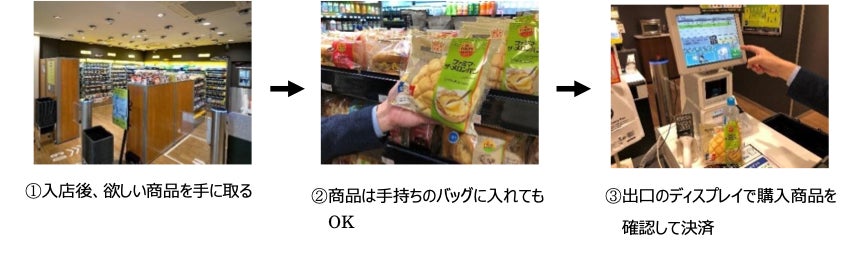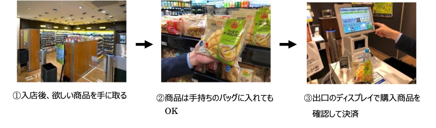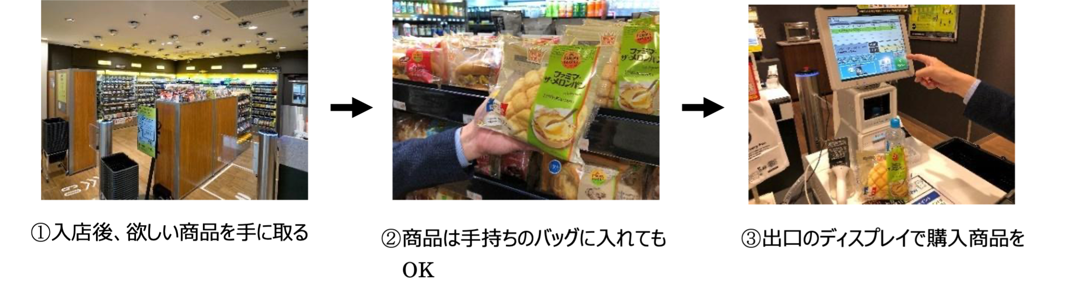 仕組みは、天井に設置されたカメラの情報から入店したお客さまと手に取った商品をリアルタイムに認識します。出口付近に設置された決済端末のディスプレイに購入商品と合計金額が自動で表示され、ファミペイを含むバーコード決済、交通系電子マネー、クレジット、現金で支払いが可能であり、スピーディにお買い物ができます。