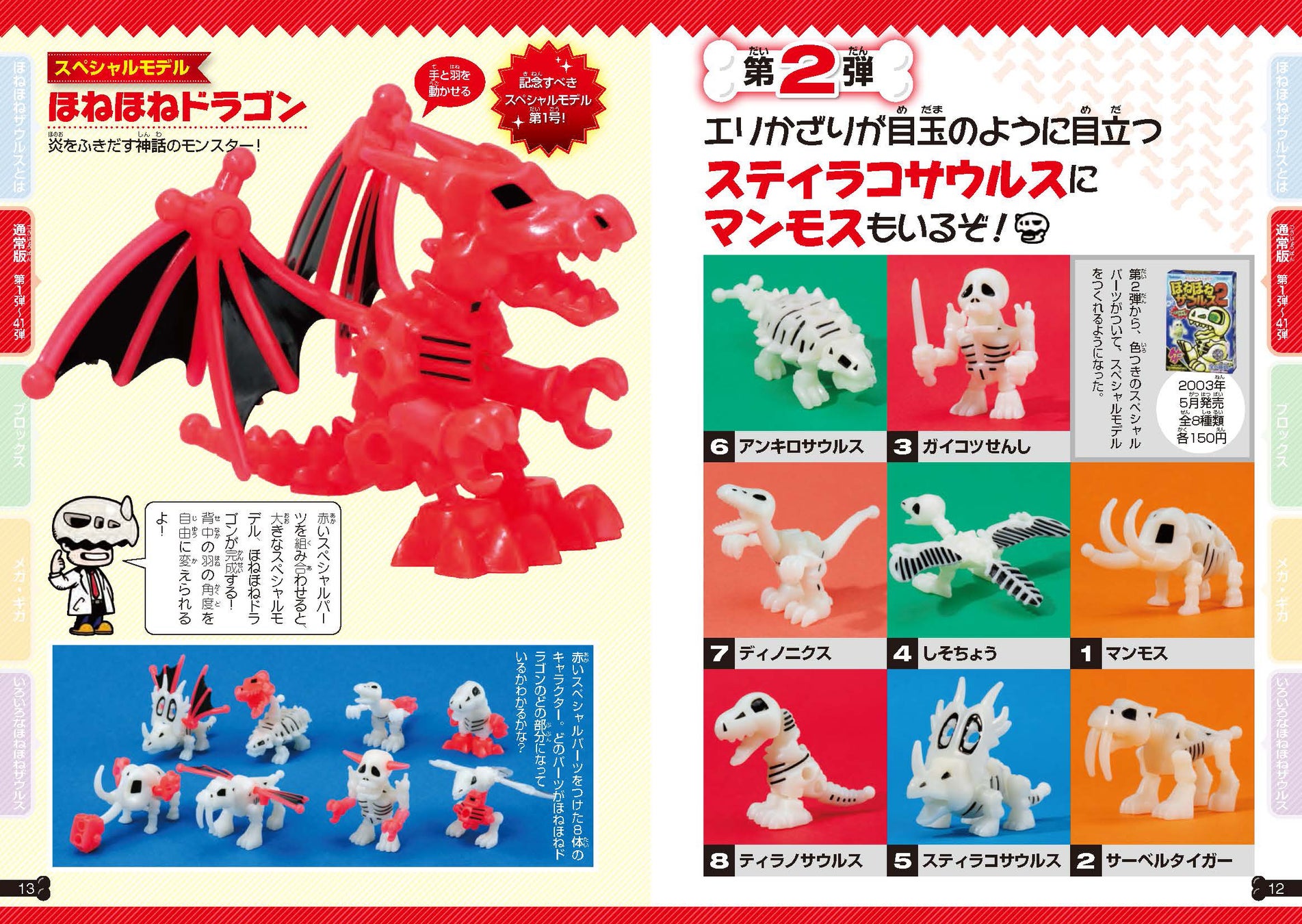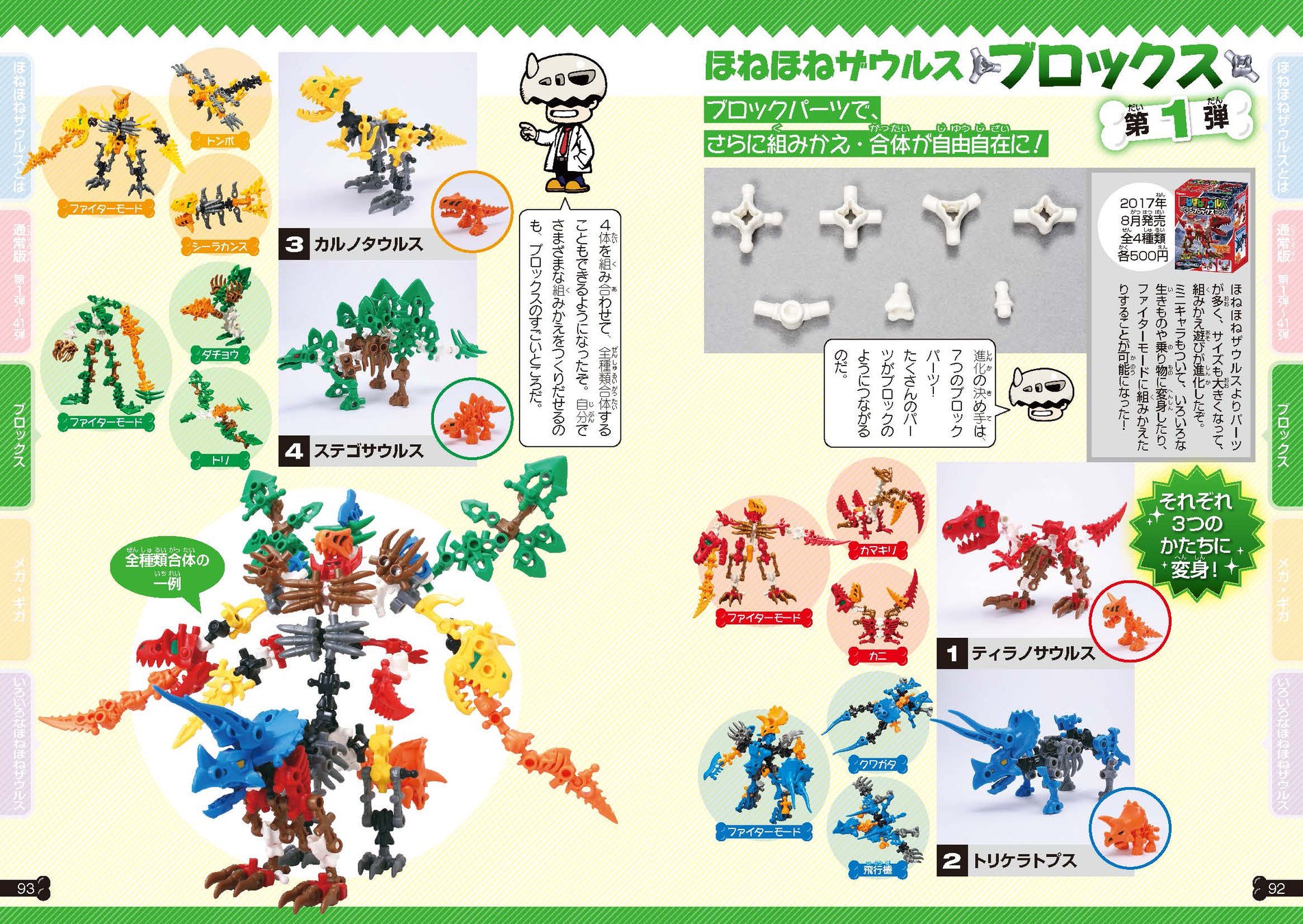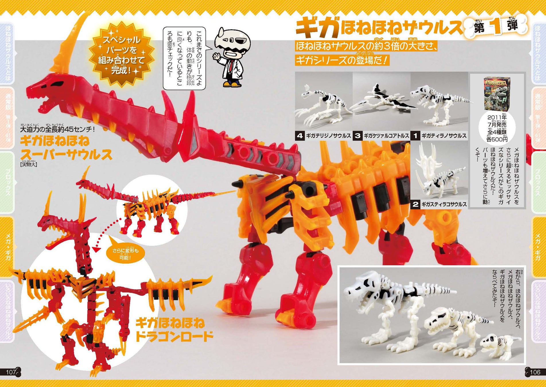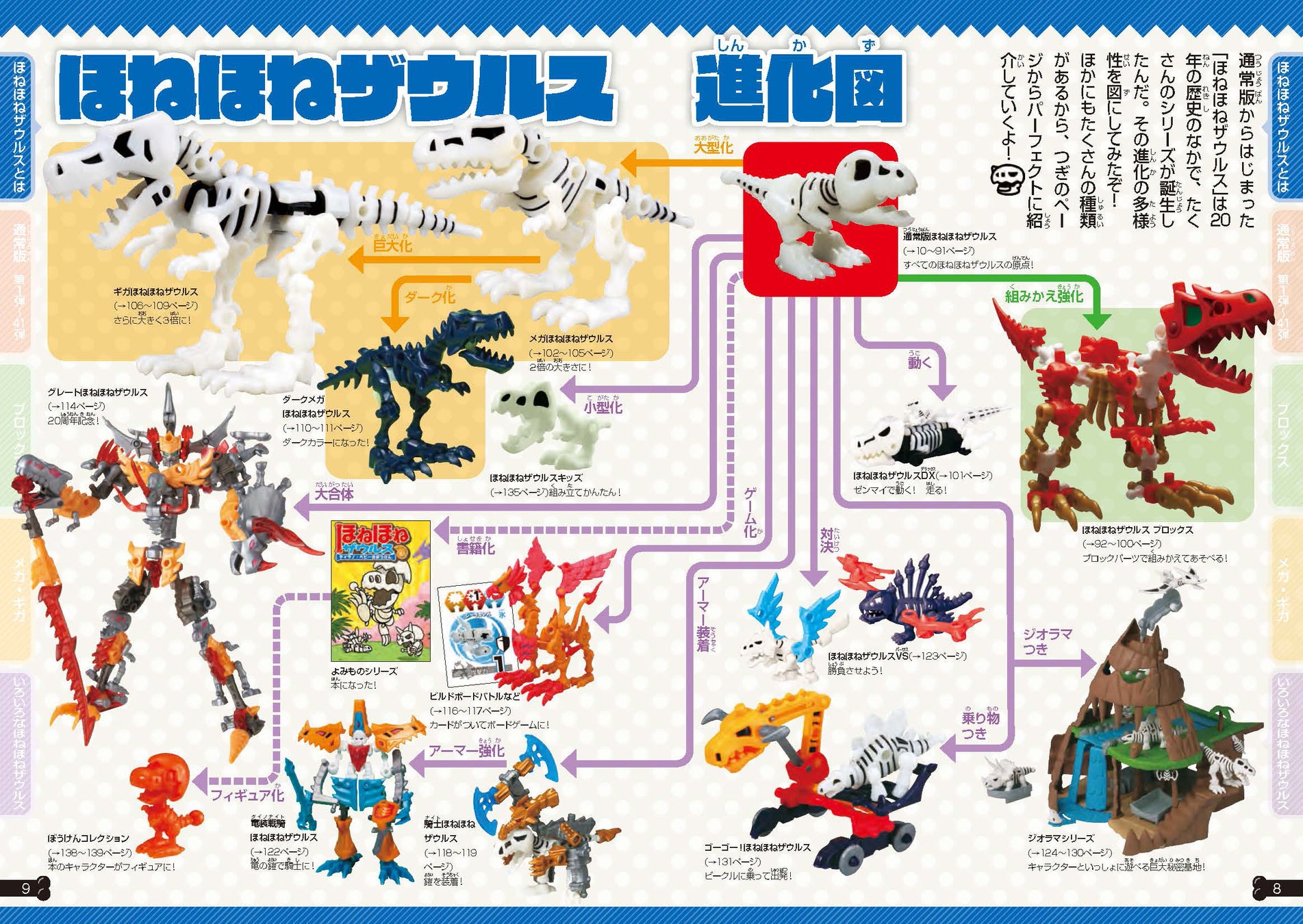 通常版よりも巨大なメガほねほねザウルスやギガほねほねザウルス、さまざまな組みかえができるほねほねザウルスブロックスなどもフルカラーで紹介。