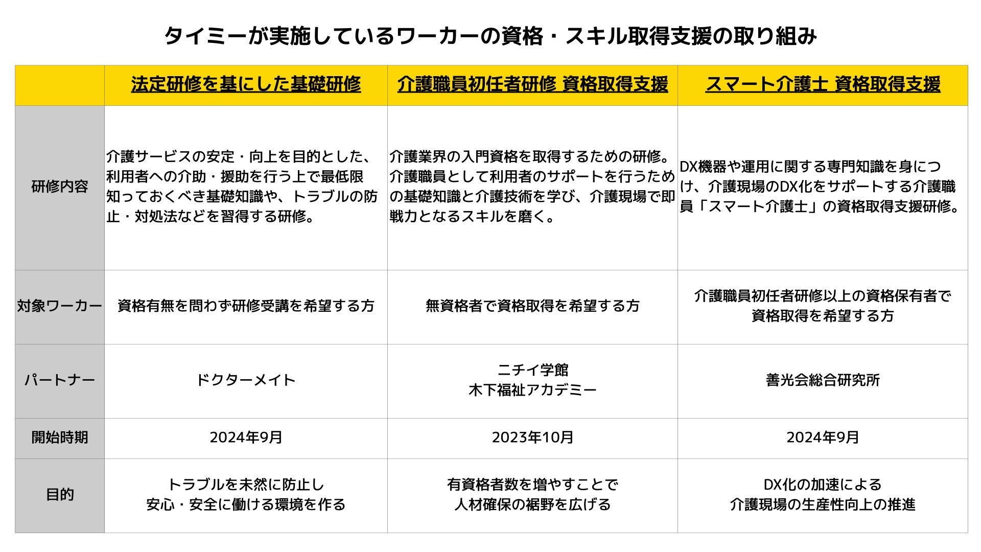 タイミーでは、介護業界でスポットワーカーが活躍できる機会を広げ、ワーカーのスキルアップ・キャリア形成支援を目的に、「タイミー」に登録している働き手に対して様々な研修を実施しています。2023年10月には介護業界の入門資格とされる「介護職員初任者研修」(※2) 、2024年9月には介護現場のDX化を推進する「スマート介護士」の育成(※3)を開始しました。そしてこの度のドクターメイトとの連携で介護の法定研修を実施することで、基礎から実践までの一連の中で、介護業界で自分が目指すキャリアに合ったスキル・資格を身につけられる選択肢を提供。これにより、介護業界の人材確保や生産性向上に一層貢献することを目指します。