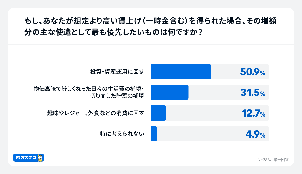「もし、あなたが想定より高い賃上げ(一時金含む)を得られた場合、その増額分の主な使途として最も優先したいものは何ですか?」という問いについては、「投資・資産運用に回す」が50.9%でトップとなり、賃上げが「消費」や「生活防衛」ではなく、「自己の資産形成のための資金」として活用される傾向が強いことが示されました。