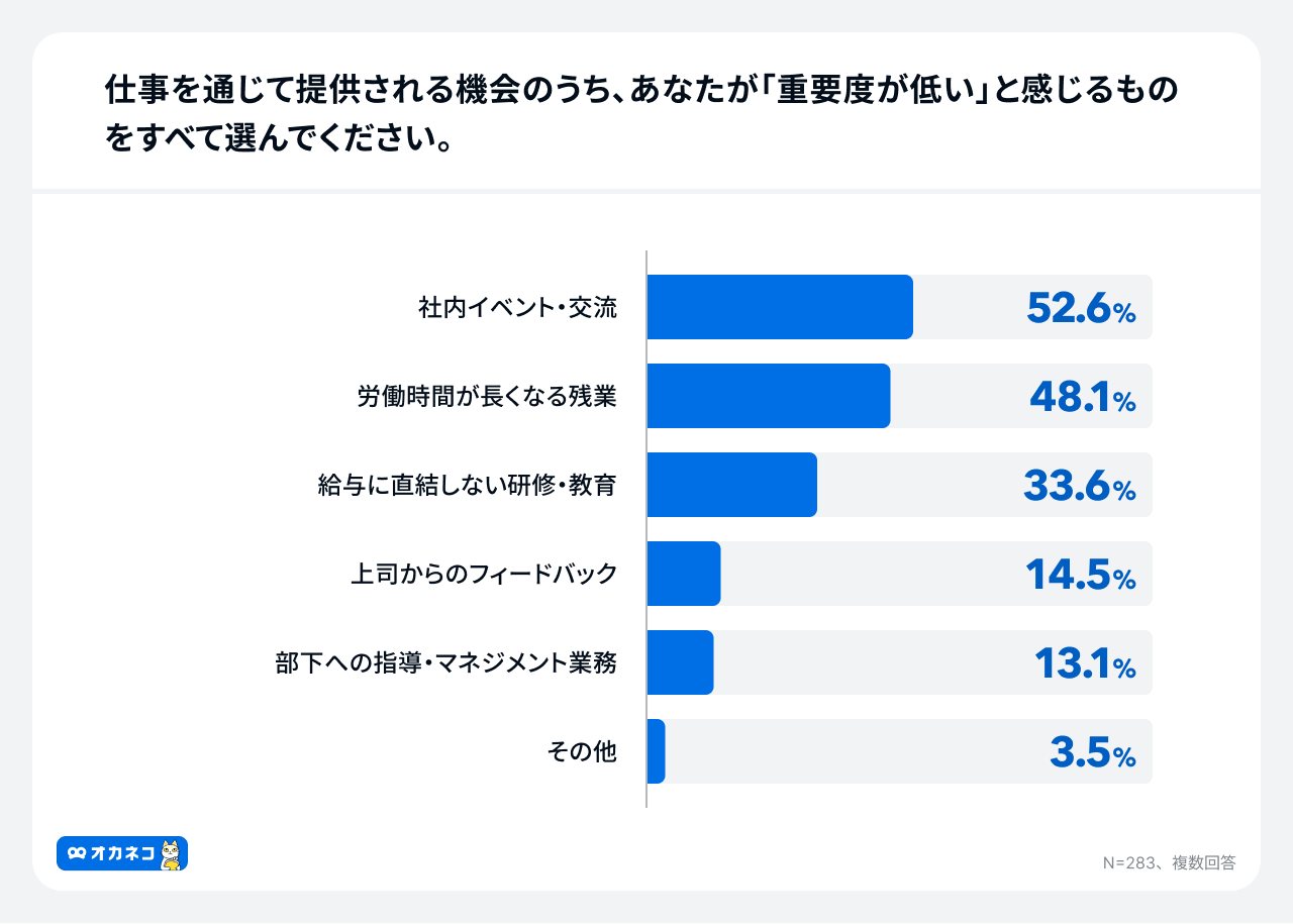 また、「仕事を通じて提供される機会のうち、あなたが「重要度が低い」と感じるものをすべて選んでください。」という問いに対し、「社内イベント・交流」52.6%、「労働時間が長くなる残業」48.1%が、それぞれ約半数に選ばれる結果となりました。また、「給与に直結しない研修・教育」33.6%と、3人に1人は自身のキャリア的な成長機会の重要度が低いことも分かりました。さらに「上司からのフィードバック」14.5%、「部下への指導・マネジメント業務」13.1%と、それぞれ重要視していない人の数が1割以上という結果になっており、直接的なリターンに繋がらない時間消費を避ける傾向が明確に表れる結果となりました。