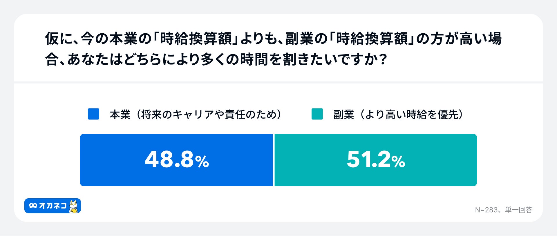 「仮に、今の本業の「時給換算額」よりも、副業の「時給換算額」の方が高い場合、あなたはどちらにより多くの時間を割きたいですか?」という問いに対し、「副業(より高い時給を優先)」に時間を割きたいという回答が51.2%となり、「本業(将来のキャリアや責任のため)」48.8 %を上回る結果となりました。