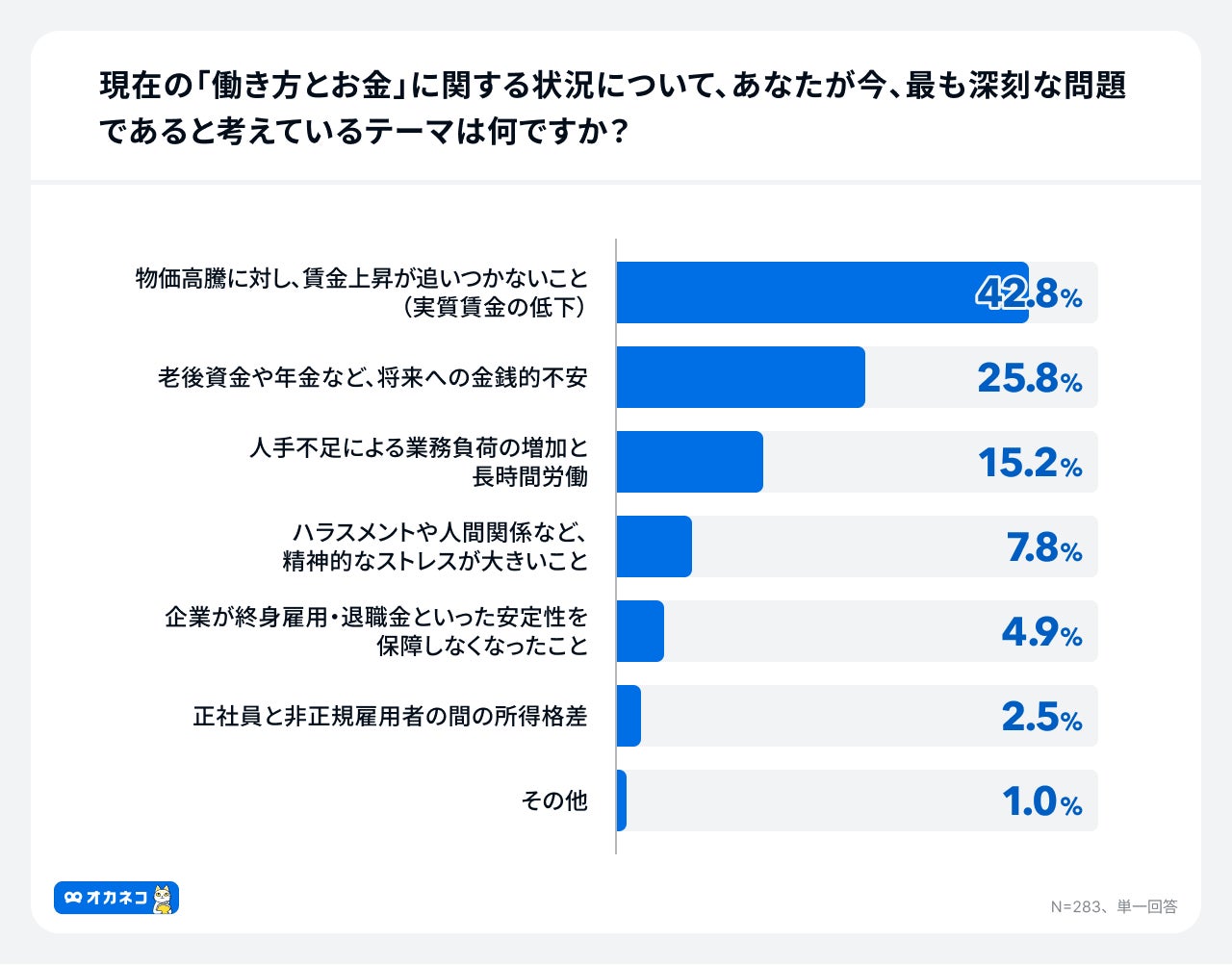 働く人が今最も深刻な問題と思うもの1位「実質賃金の低下」42.8%