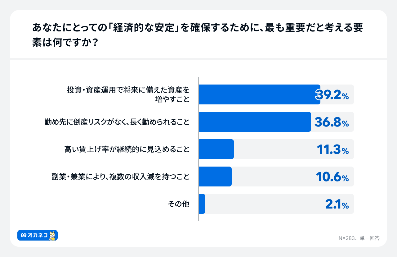 「あなたにとっての「経済的な安定」を確保するために、最も重要だと考える要素は何ですか?」という問いに対し最も多かった回答は、「投資・資産運用で将来に備えた資産を増やすこと」39.2%となりました。次いで「勤め先に倒産リスクがなく、長く勤められること」36.8 %、「高い賃上げ率が継続的に見込めること」11.3%、「副業・兼業により、複数の収入源を持つこと」10.6%となりました。
