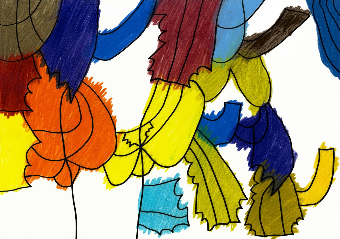 作品制作は小林氏が在籍する、るんびにい美術館(岩手県花巻市)のアトリエで行いました。本作品を描く前に、「クッキーのアトリエ」で提供する5つのお菓子『クッキーパレット』を小林氏が試食。鮮やかな色合いで陳列されたクッキーパレットを目の前に終始ワクワクした様子で、「クッキーがおいしい」「バナナが一等賞」などと話しながら、次々と口に運び、わずか10分ほどで完食しました。その後、作品に彩色すると、ヨックモックのコーポレートカラーであるブルーに加え、バナナの黄色やベリーの赤色などクッキーからインスピレーションを受けたようなカラーが力強く塗られ、小林氏自身がお菓子から感じたものが作品に込められているようでした。