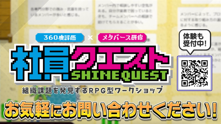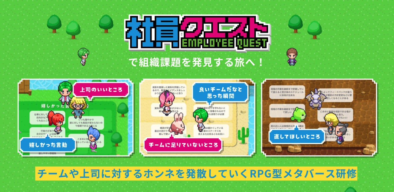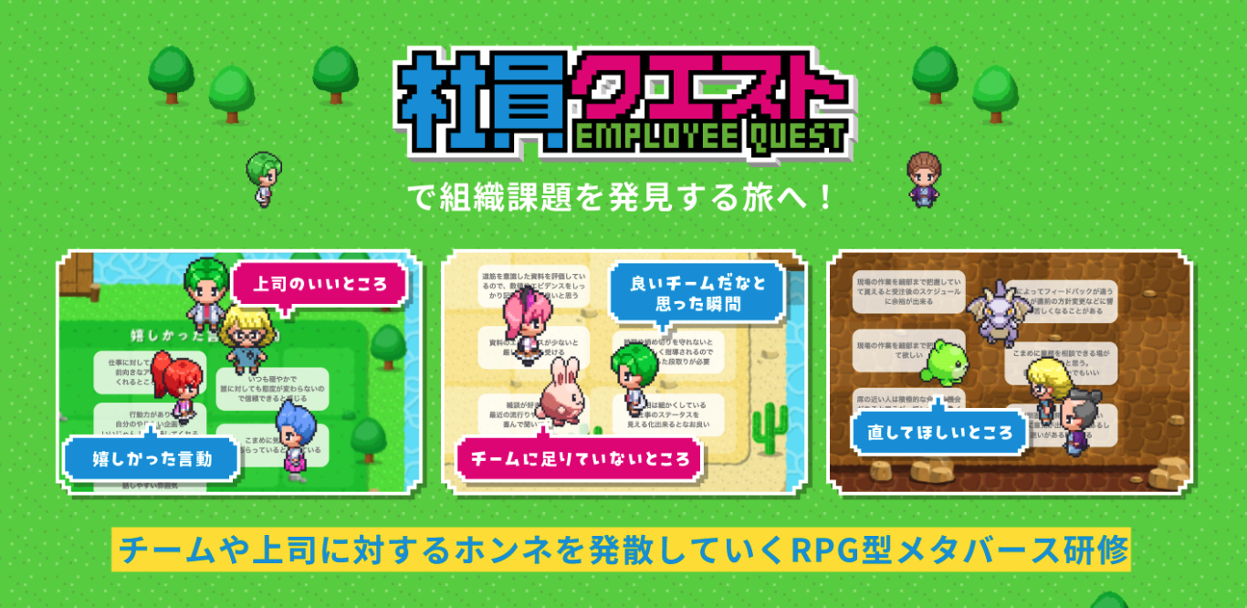 『社員クエスト』は、メタバースのゲーミフィケーションと匿名性を活かして、チームや上司に対する「ホンネ」を発信することでクリアを目指す、ロールプレイングゲーム型のワークショップです。