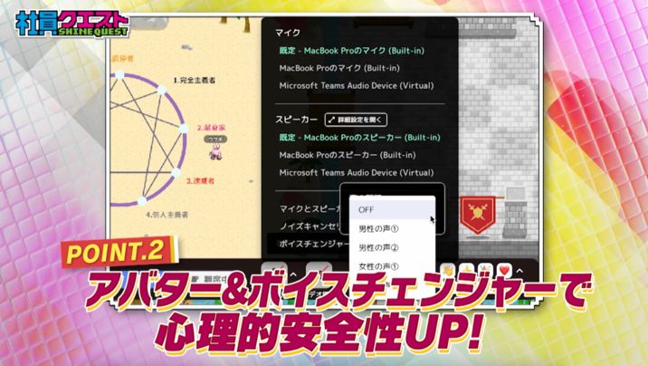 メタバースワークには匿名のキャラクターになって参加。ボイスチェンジャー機能も搭載し、安心して意見を発散出来ます。