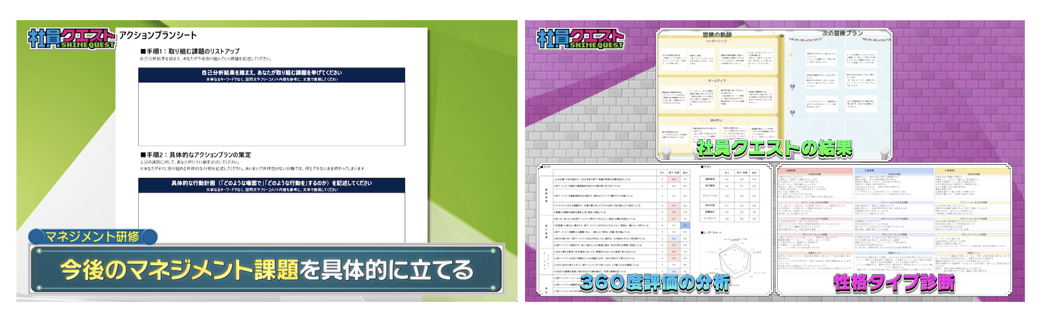 「360度評価」と「性格タイプ診断」などのアセスメントも活用し、定性/定量 両面のデータから改善策を立案できる研修です。