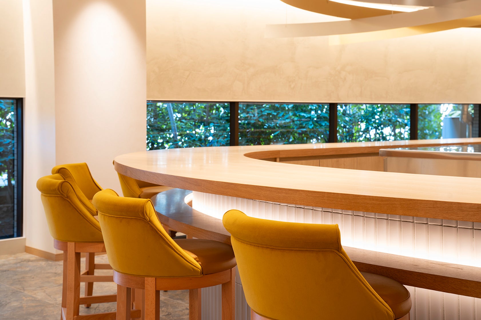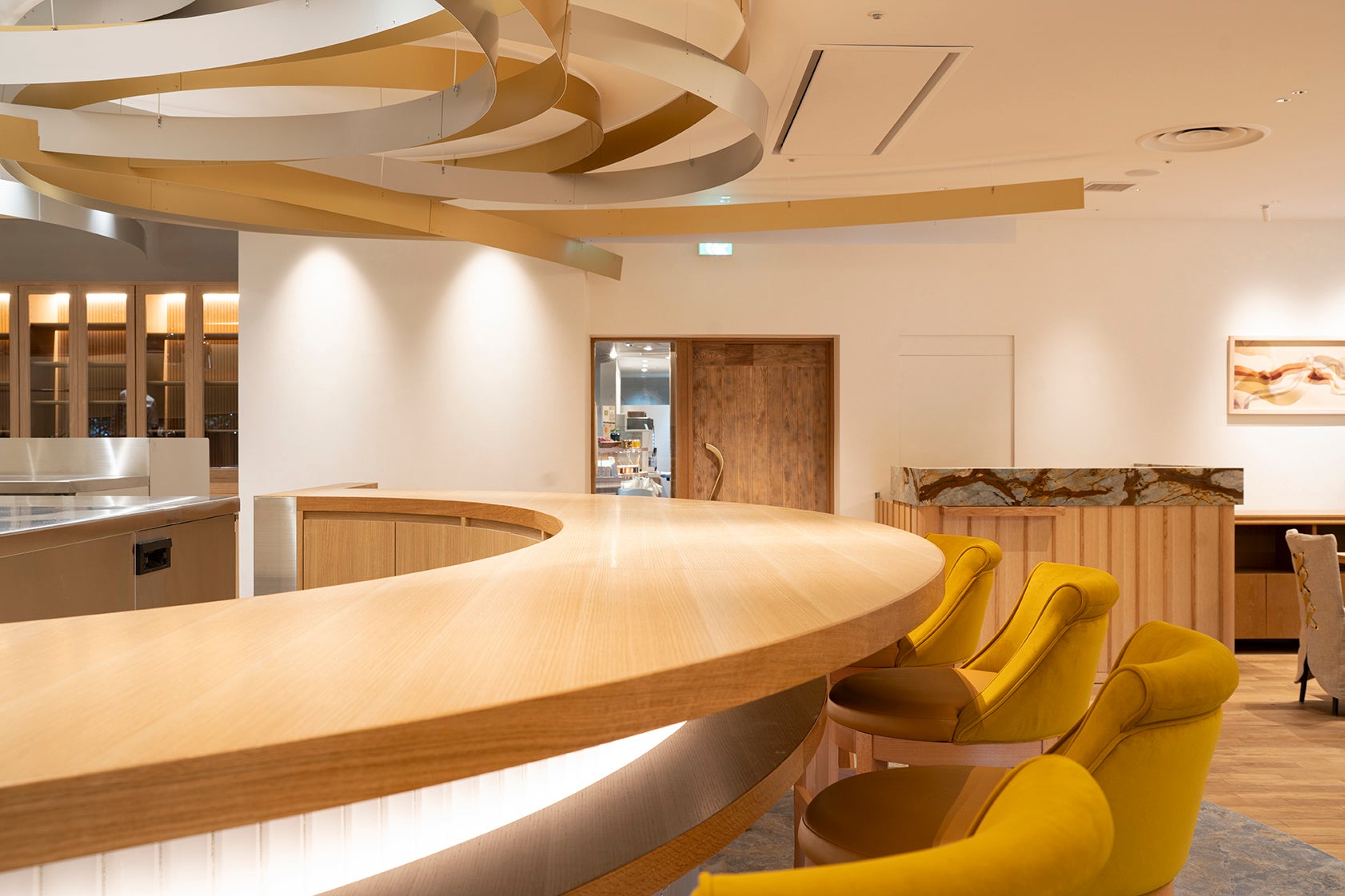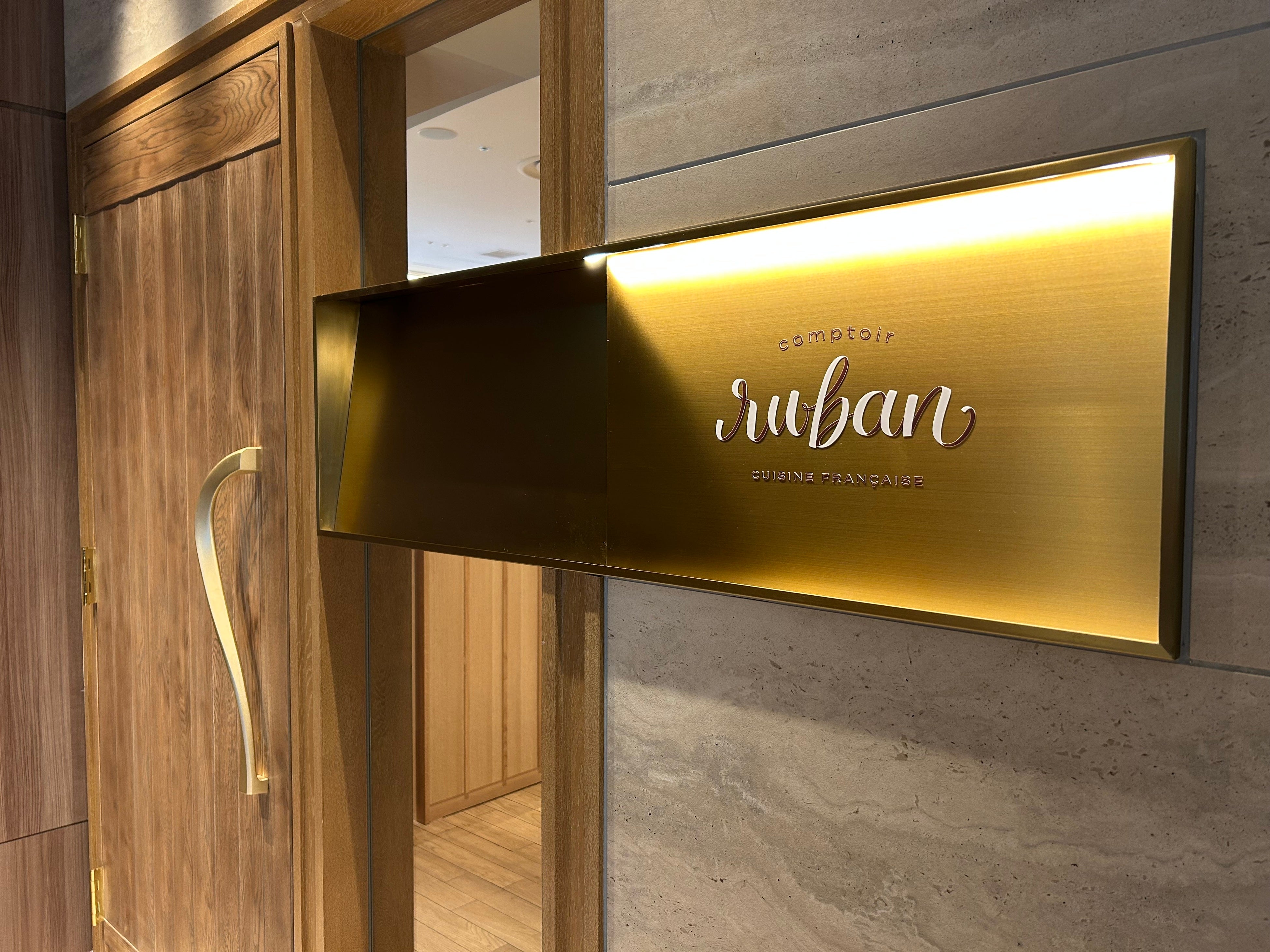 店内は特等席とも言えるカウンター席(フランス語でコントワール)が16席あり、オープンキッチンを楕円で囲むように配置され、シェフたちが料理を仕上げる様子をライブ感たっぷりにお愉しみいただけます。カウンター席の天井部分には、店名の由来となったリボン(フランス語でリュバン)をモチーフとしたオブジェが飾られています。テーブル席の椅子はリボンが飾られたチェアカバーが掛けられ、店内アートにもリボンにまつわる作品を使用しています。