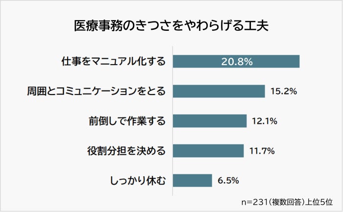 「医療事務のきつさをやわらげる工夫」として最も多かった回答は「仕事をマニュアル化する(20.8%)」でした。以下、2位「周囲とコミュニケーションをとる(15.2%)」、3位「前倒しで作業する(12.1%)」が続きます。