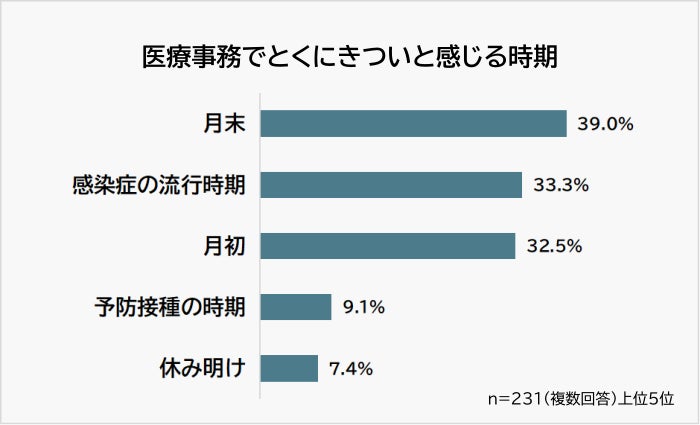 「医療事務でとくにきついと感じる時期」を聞いたところ、1位は「月末(39.0%)」、2位「感染症の流行時期(33.3%)」、3位「月初(32.5%)」でした。