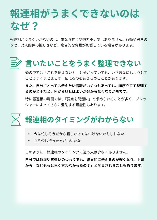 本資料では、報連相がうまくできない原因を解説した上で、今日から実践できる具体的な対処法を紹介しています。