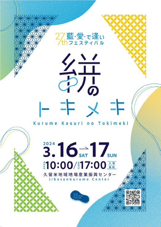 令和6年3月16日(土)と17日(日)に、今年で27年目を迎える「藍・愛・で逢いフェスティバル ~絣のトキメキ~」を開催します。織元や問屋が一堂に会し久留米の伝統的工芸品「久留米絣(かすり)」の新たな魅力を伝えます。