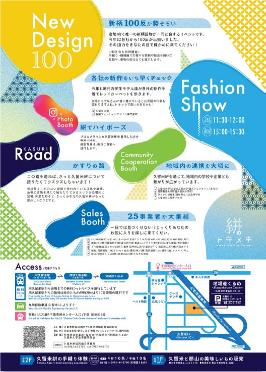 「藍・愛・で逢いフェスティバル」は、久留米絣の魅力満載のイベント。織元・問屋が一堂に会し久留米絣の新作や創作品の発表、布・服などの販売を行います。このほかファッションショーや写真撮影会、体験教室など盛りだくさんの企画で、久留米絣を身近に感じていただけます。入場は無料です。今回は、KASURI ROAD(かすりの路)と銘打ち、久留米絣ができるまでを中間製品・道具等を交えて紹介する展示や、域内の教育機関で実施された絣に関する研究成果を紹介するブースもあります。