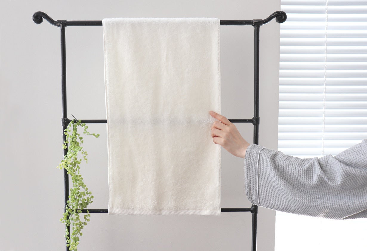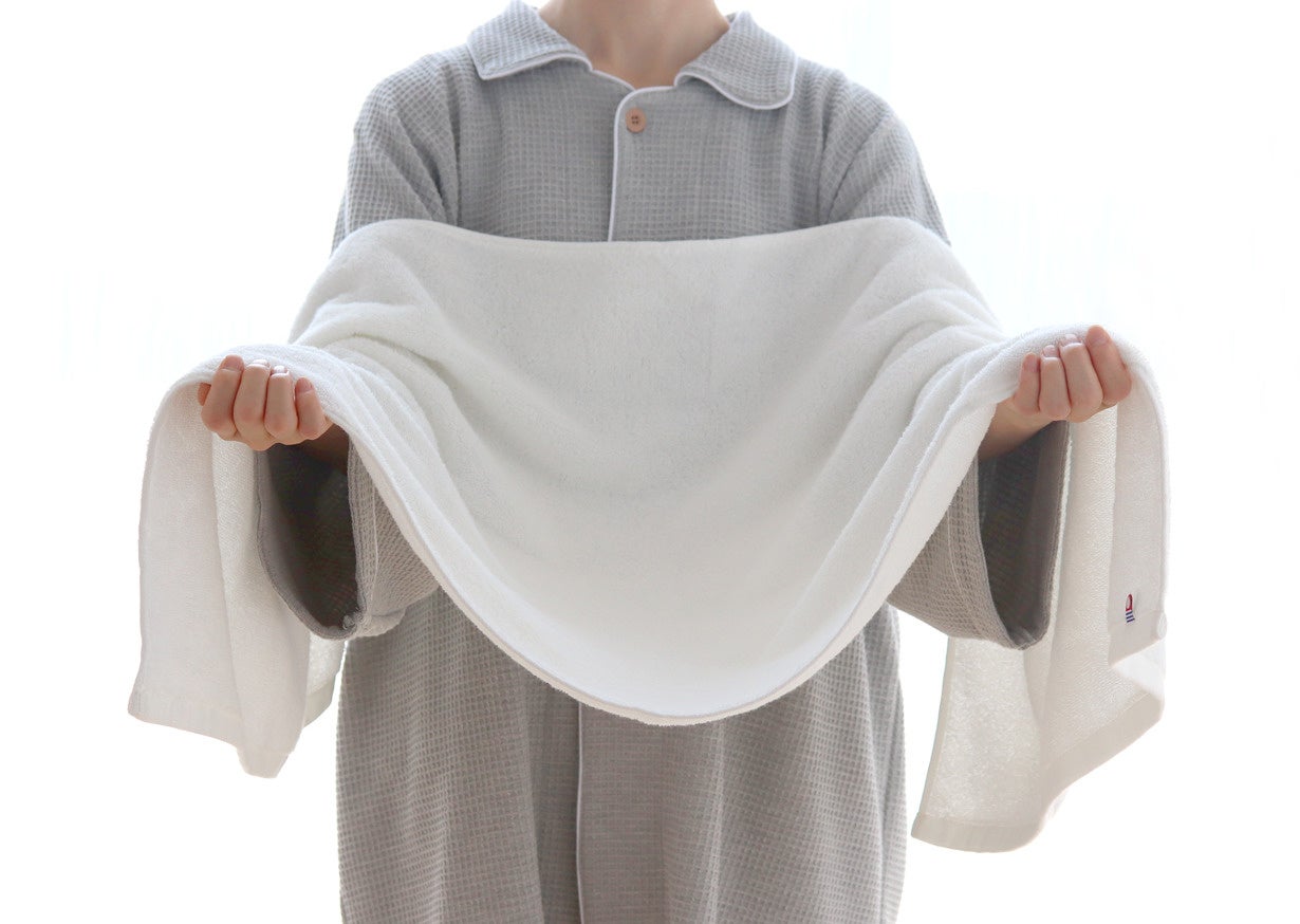 スーパーZERO®とは、この加工を施すと糸に空気を多く含み、同じ重さでもボリューム感のあるタオルになり、洗濯をしてくり返し使いこむほどに、ふっくらとやわらかな風合いとなります。また、吸水性に優れているので、体や髪への摩擦も少なく、摩擦によるダメージを軽減する事ができる髪にも肌にも優しいアイテムです。