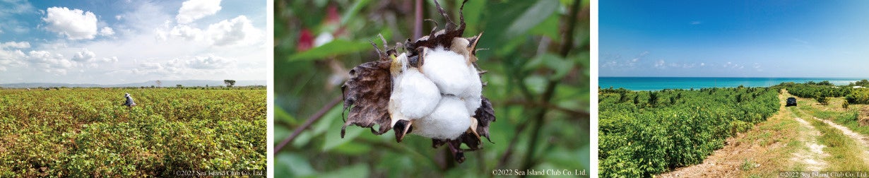 商品に使用している海島綿は、西インド諸島の限られた地域に生育する超長綿です。普通の綿の繊維長が20~25mmであるのに対し、超長綿は繊維長35mm以上の物を指します。その超長綿の中でも、トップレベルの繊維長をもつのが海島綿です。繊維長が長いと糸を紡ぐ際に撚り回数が少なくて済むので、柔らかくしなやかな糸ができ、なめらかな肌触りとシルクのような光沢が生まれます。