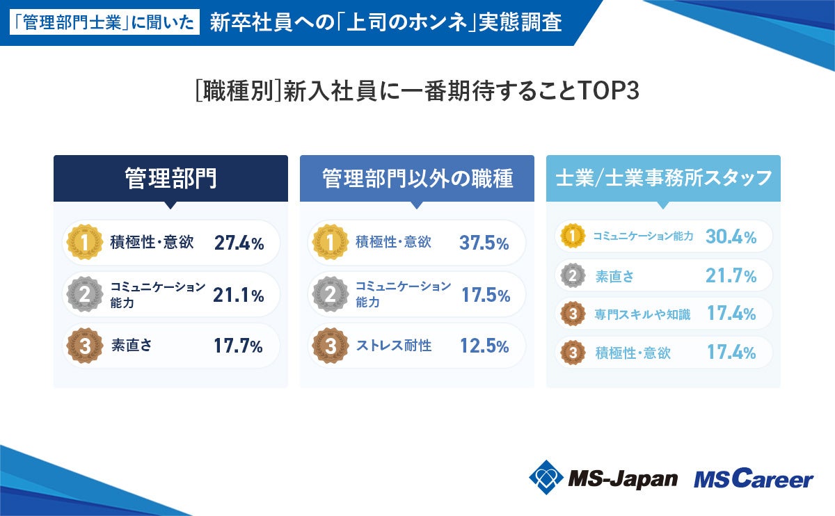 ・TOP3に、管理部門以外の職種は「ストレス耐性」が、士業/事務所スタッフは「専門スキルや知識」がランクイン