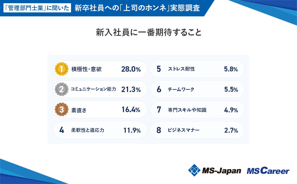 ①【新卒に一番期待することは「積極性・意欲(28%)」が1位】