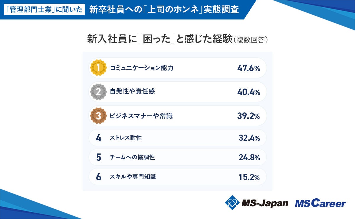 「困った」と感じた経験TOP3は、1位が「コミュニケーション能力(47.6%)」、2位が「自発性や責任感(40.4%)」、3位は「ビジネスマナーや常識(39.2%)」となりました。