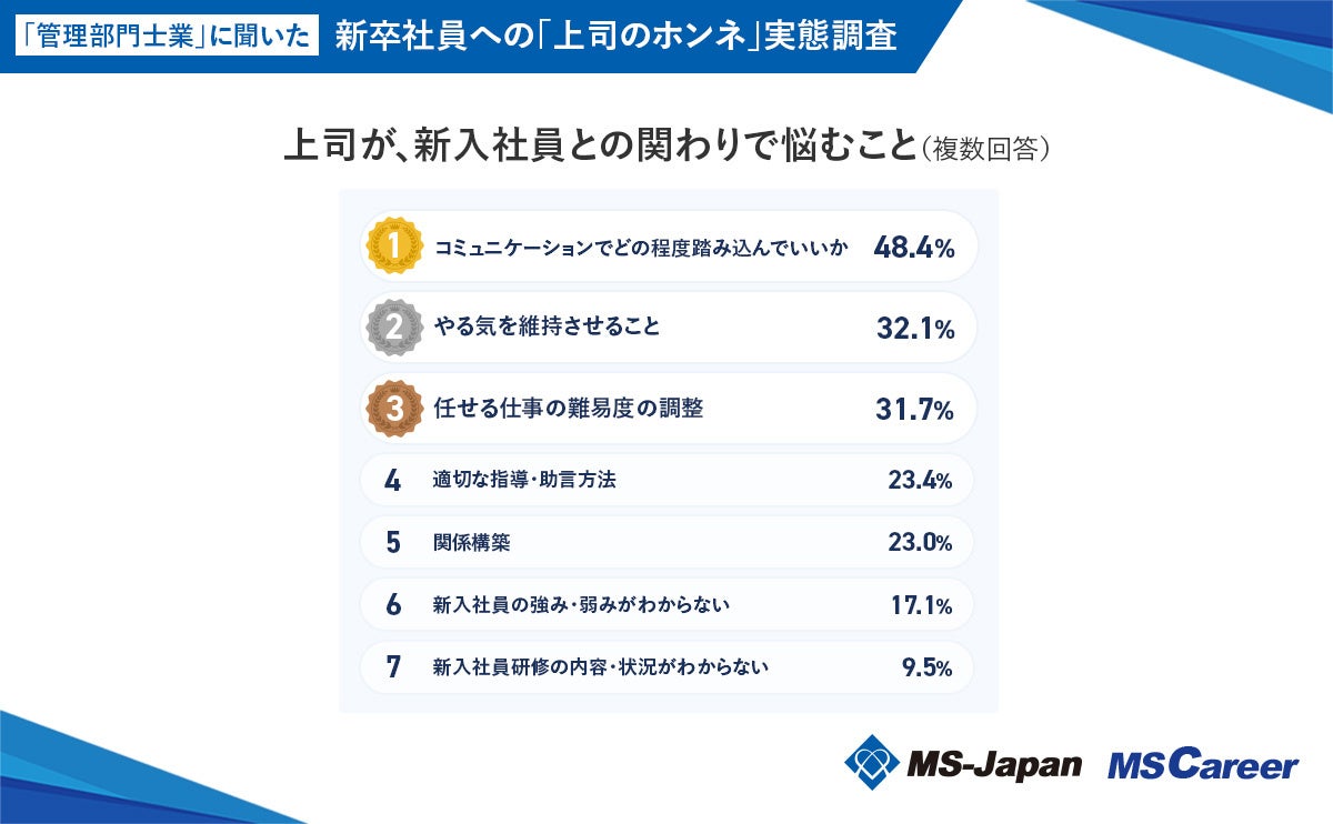 また、上司が新卒との関わりで悩むことについても調査を行うと、1位は「コミュニケーションでどの程度踏み込んでいいか(48.4%)」で、全体の約半数を占め、困ったことに続きこちらも「コミュニケーション」が1位に。