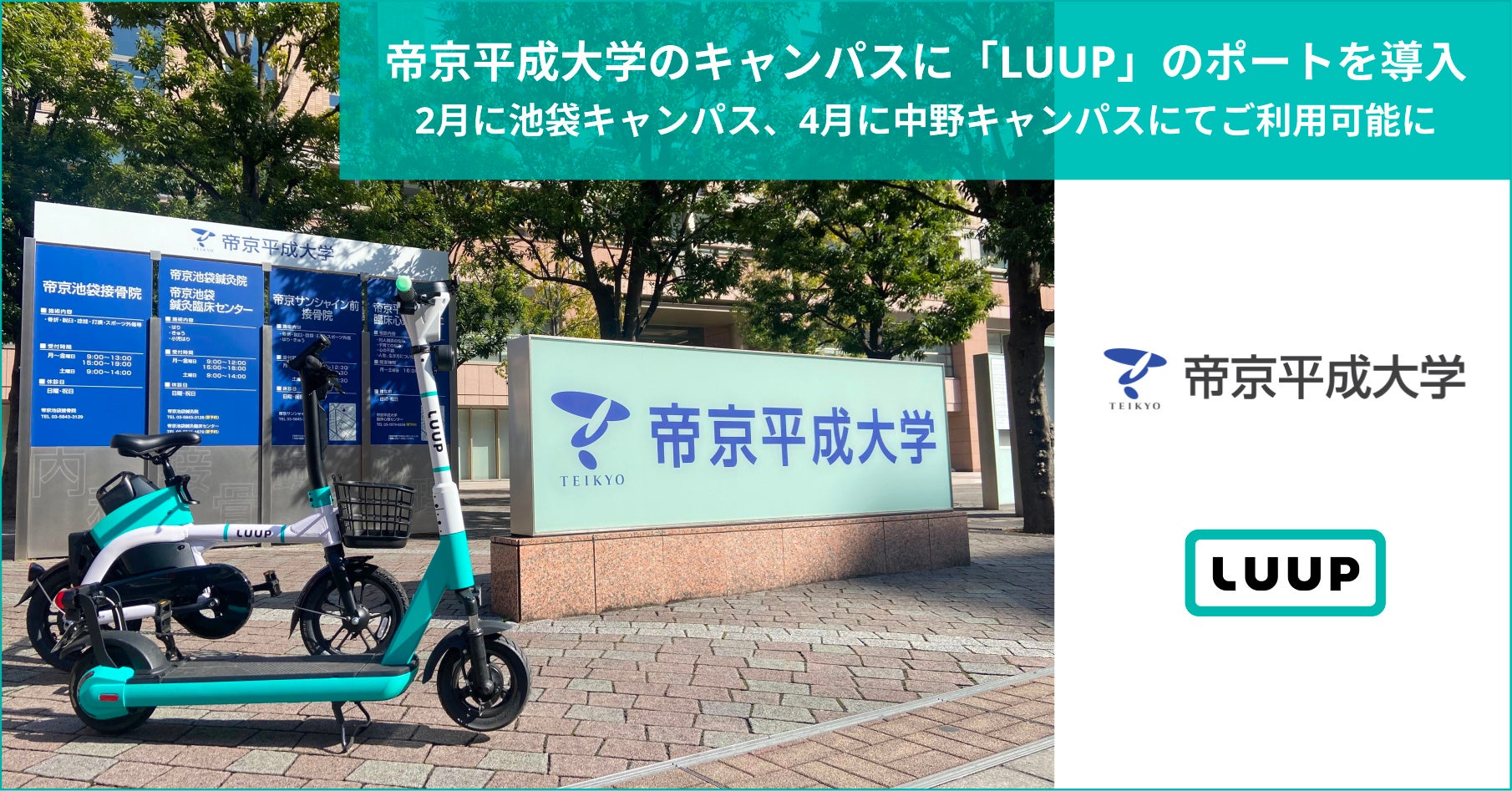 株式会社Luup(本社:東京都千代田区、代表取締役社長兼CEO:岡井大輝、以下「Luup」)は、学校法人帝京平成大学(所在地:東京都豊島区東池袋2丁目51−4、理事長:冲永佳史)が運営する帝京平成大学 池袋キャンパスおよび中野キャンパスに電動マイクロモビリティのシェアリングサービス「LUUP(ループ)」のポートを導入し、それぞれ2024年2月13日(火)、4月1日(月)※予定 より利用可能となることをお知らせします。なお、都内における私立の総合大学へのポートの導入は今回が初となります。