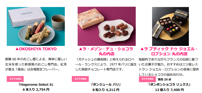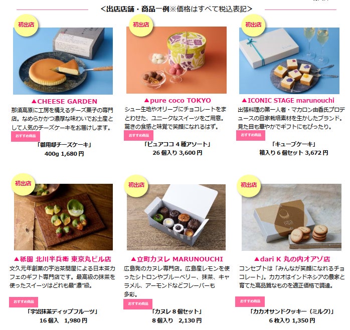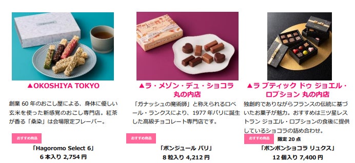 文久元年創業の宇治茶問屋による日本茶ギフト専門店『祇園 北川半兵衞 東京丸ビル店』や、京都発のカカオ・チョコレート専門店『dari K 丸の内オアゾ店』など、ここ数年で新たに丸の内エリアに加わった店舗や、丸の内エリアでも絶大な人気を誇る『ラ・メゾン・デュ・ショコラ 丸の内店』や『ラ ブティック ドゥ ジョエル・ロブション 丸の内店』などから、今年も名品ショコラが登場します。また生乳生産量全国第2位の栃木県に店舗を構える『CHEESE GARDEN』のなめらかかつ濃厚な味わいの「御用邸チーズケーキ」や、岐阜県発のクッキー専門店『marl』による世代問わず楽しめる新感覚のソフトクッキー「ほおばるクッキー」など、本催事初出店となる店舗を含め、全21店舗の多彩なブランドが登場します。