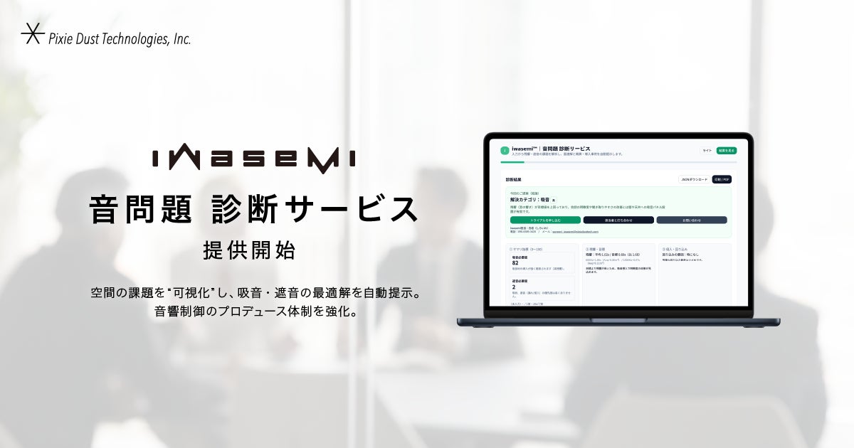 ピクシーダストテクノロジーズ株式会社(本社:東京都中央区、代表取締役会長:落合陽一、代表取締役社長:村上泰一郎、以下PxDT)は、空間における音環境の課題を解析し、吸音/遮音の最適な改善提案を行う「iwasemi™|音問題 診断サービス」の提供を開始したことをお知らせいたします。