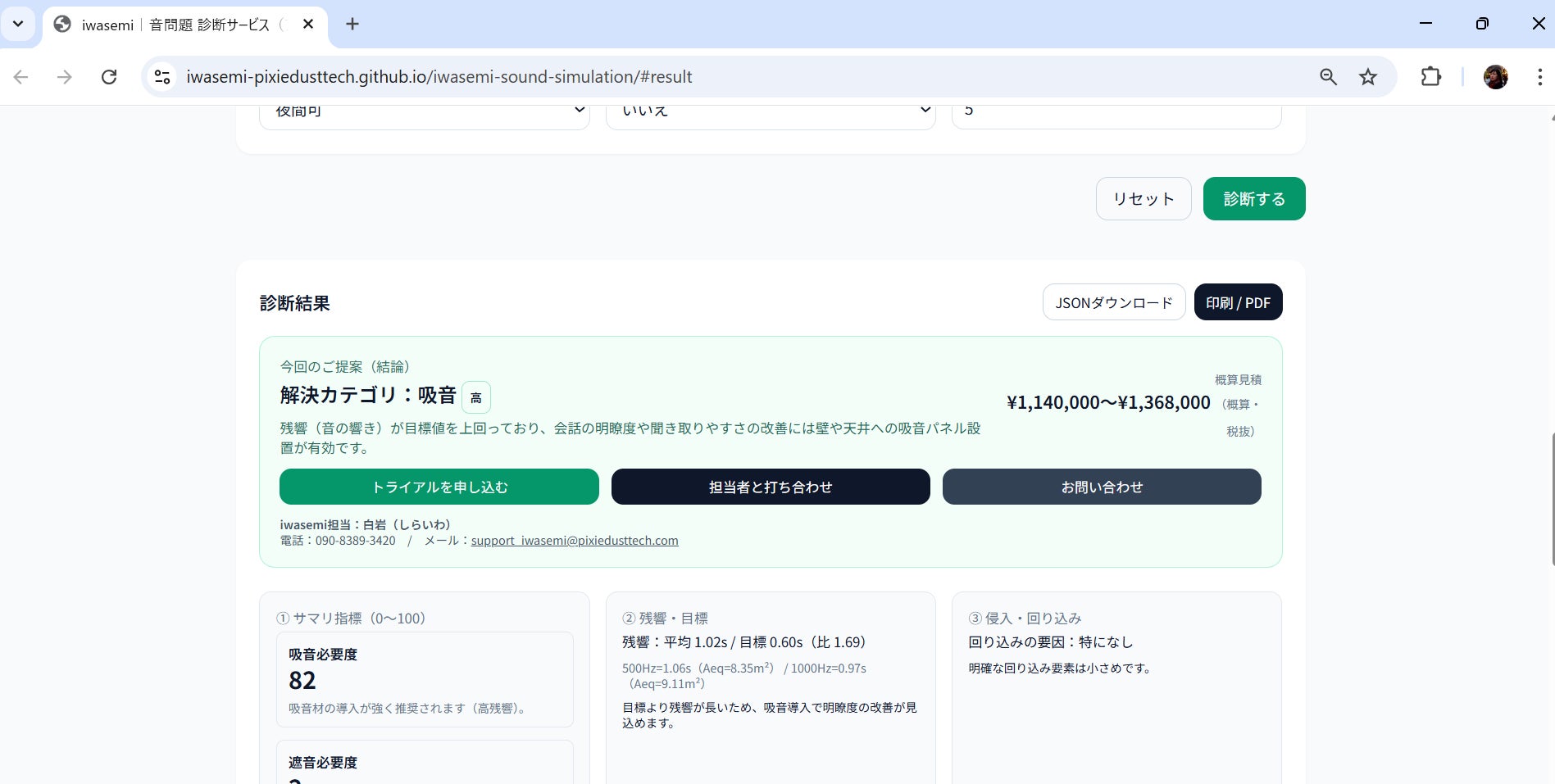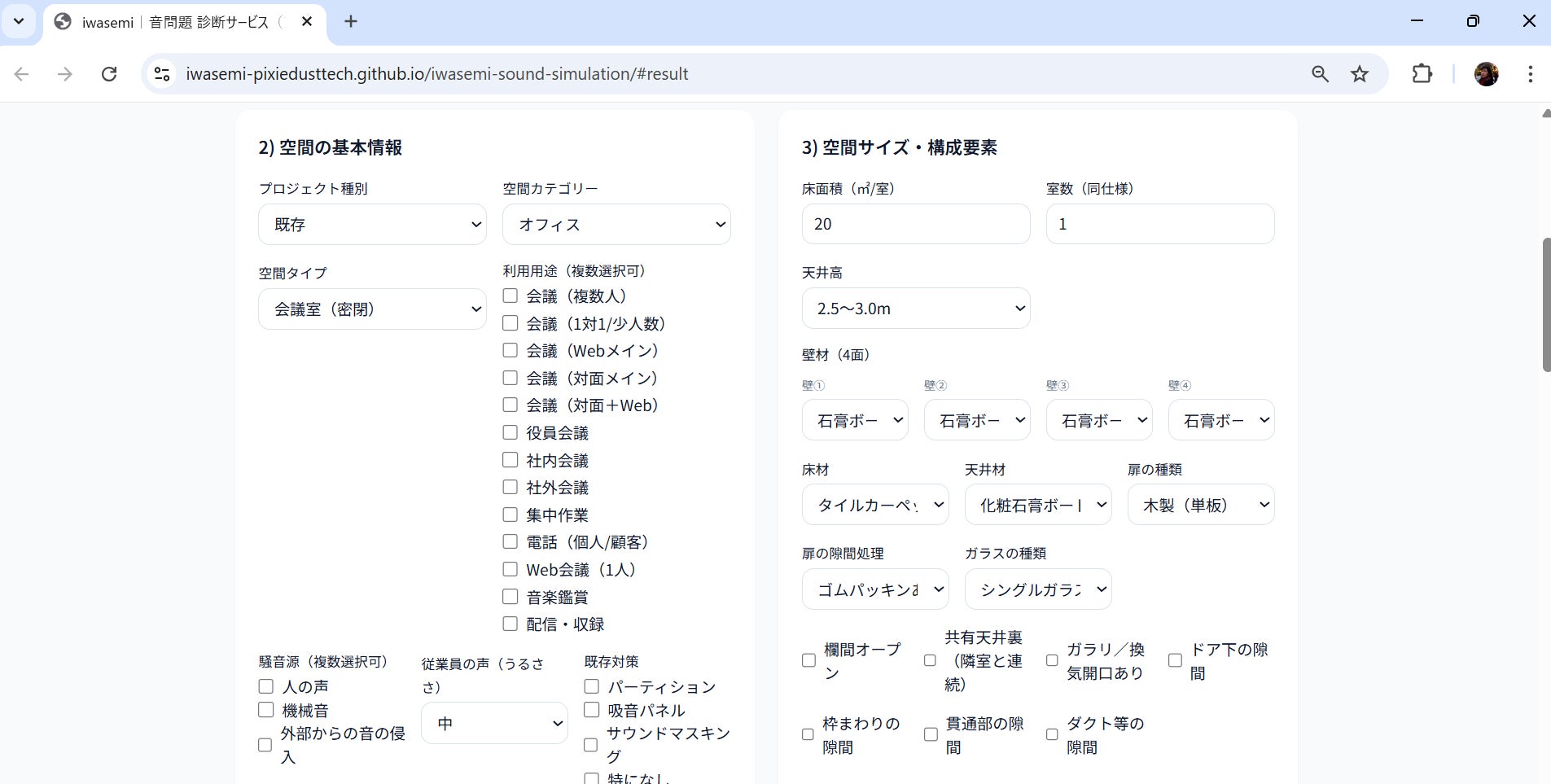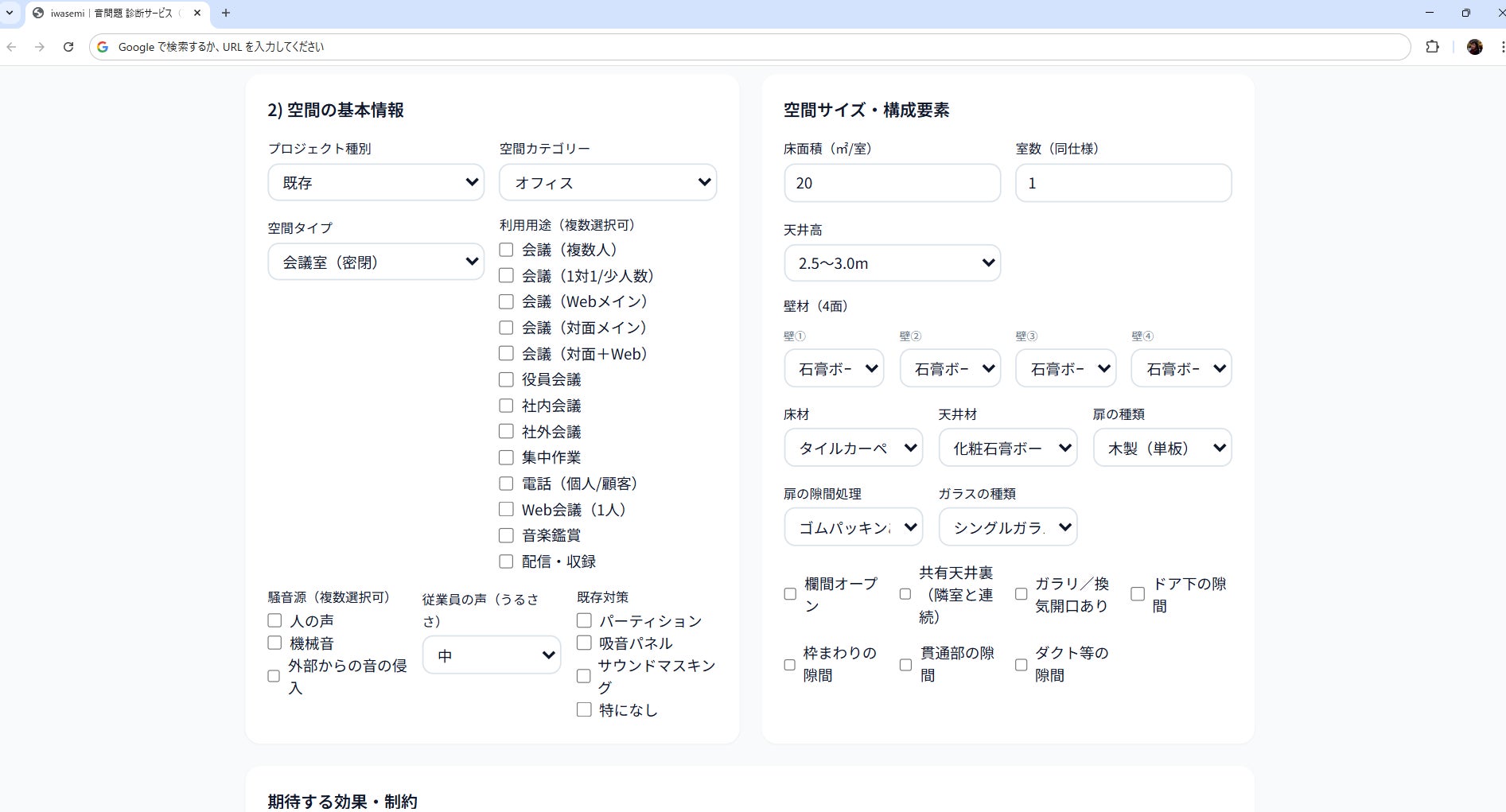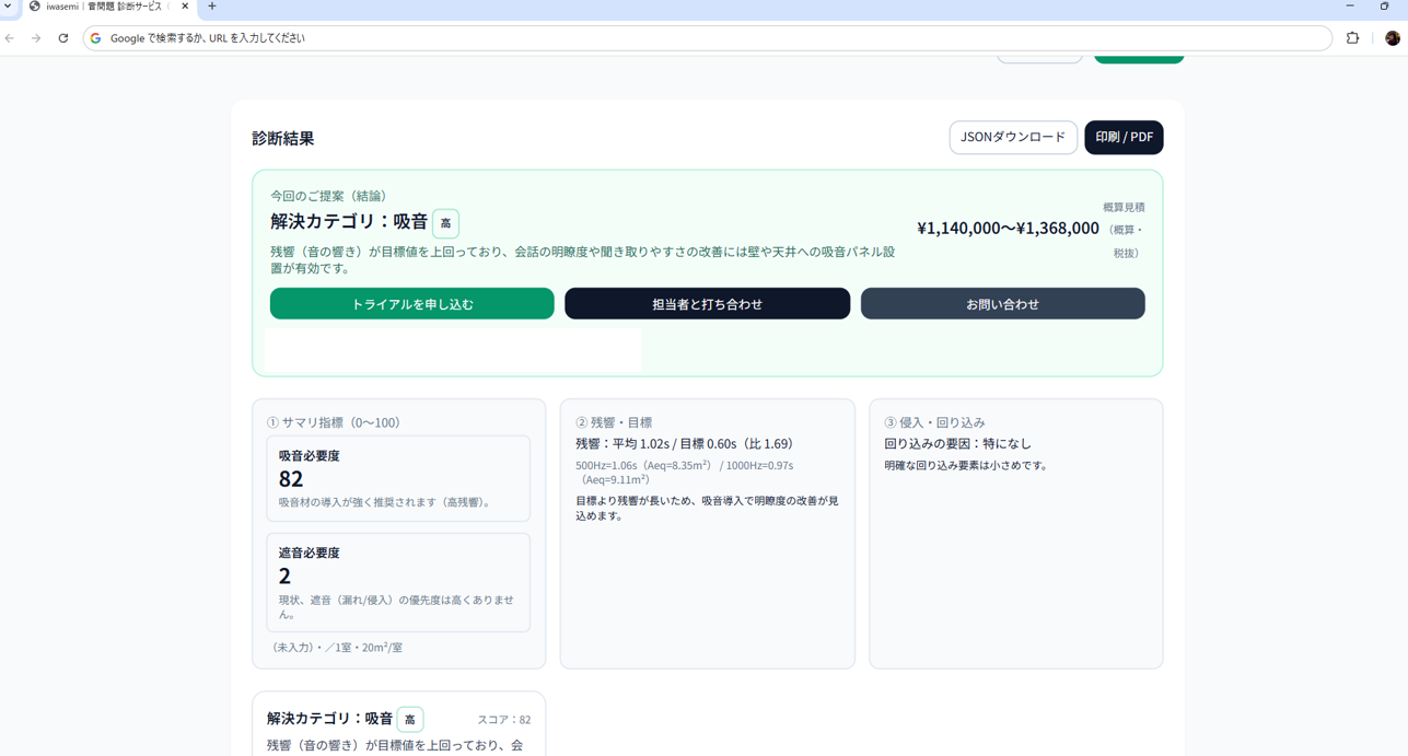 本サービスでは、空間の基本情報やサイズ・構成要素、期待する効果や制約条件を入力することで、対応すべき音響課題とその解決方針・概算コストまでを自動提示します。