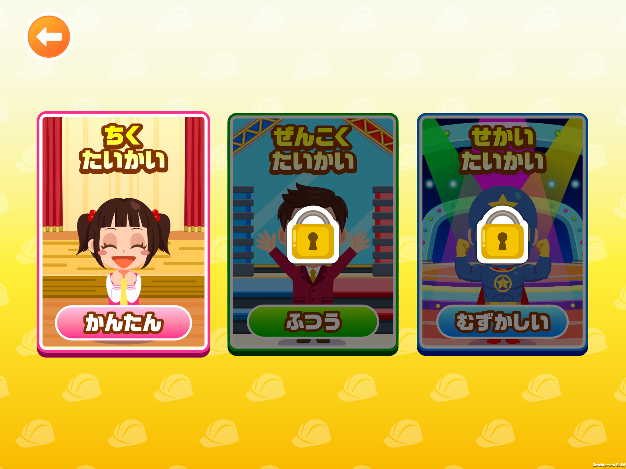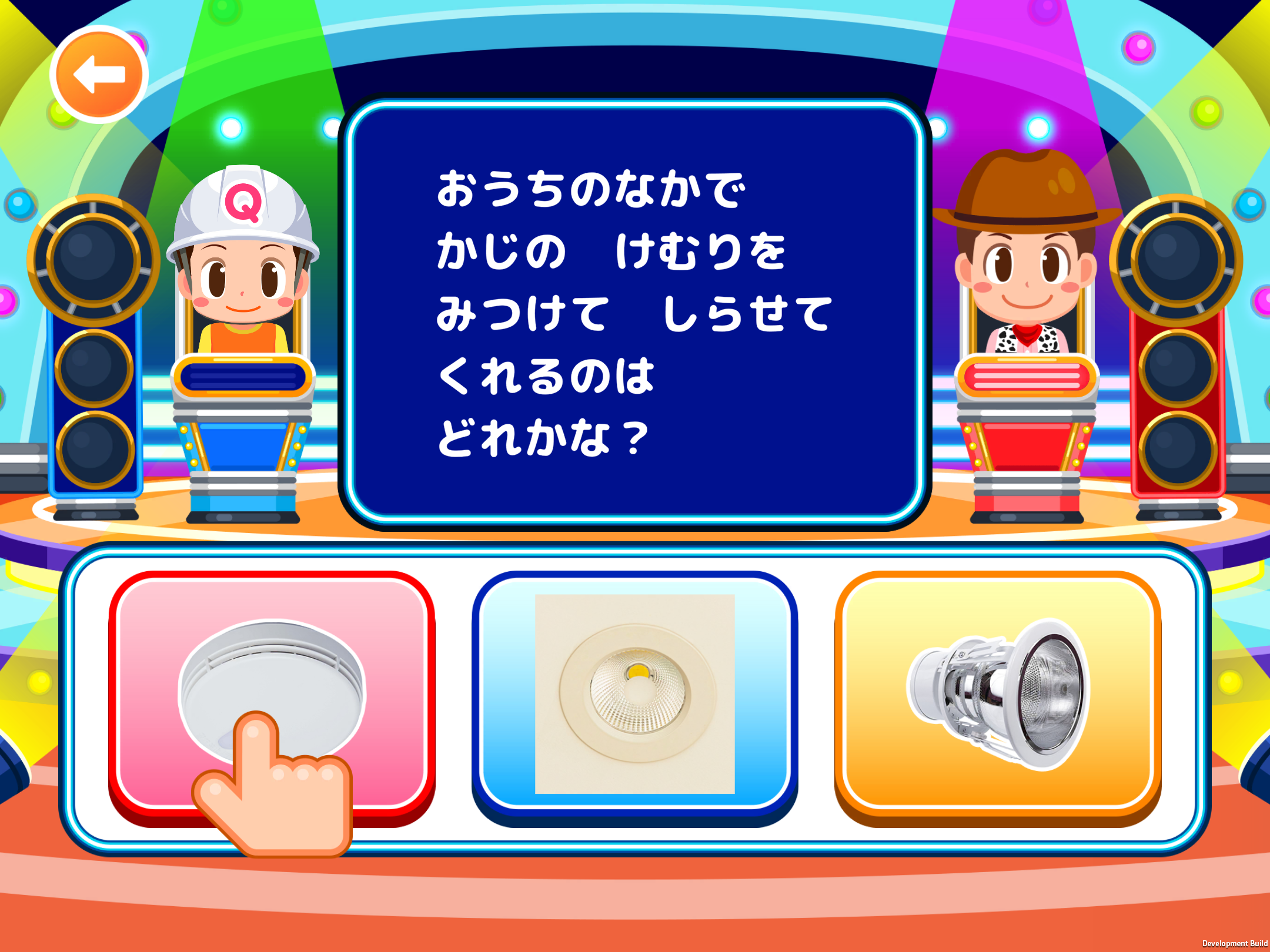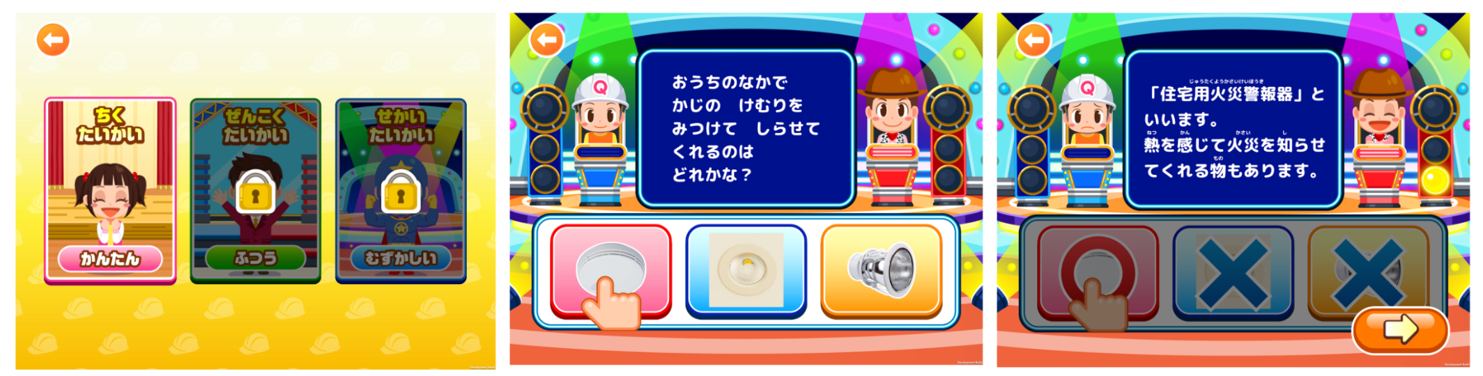火災や災害、防災設備等にまつわる問題に解答し、3問先取することを目指すCPU対戦型のクイズゲームです。「ちくたいかい」からスタートし、クリアするごとに「ぜんこくたいかい」「せかいたいかい」と、次のステージに進むことができます。ステージが進むごとに、ゲームの難易度があがるため、ステージをクリアしながら自然にたくさんの防災知識を身に付けていくことができます。