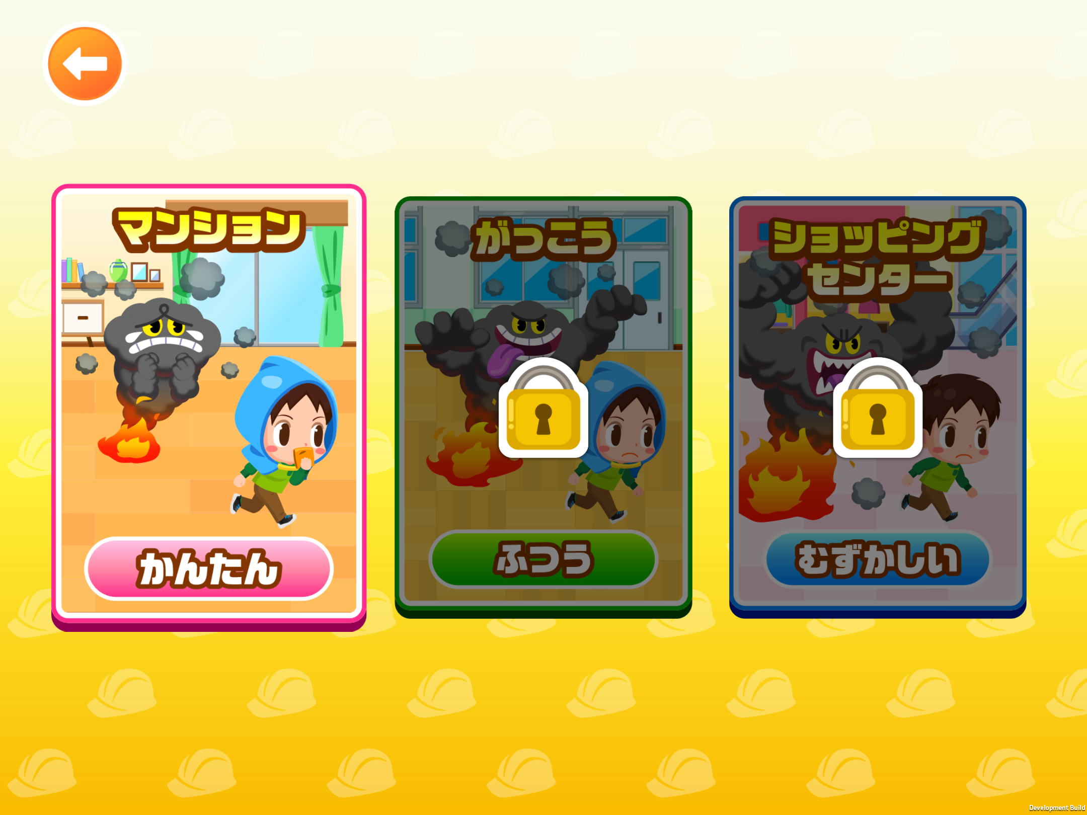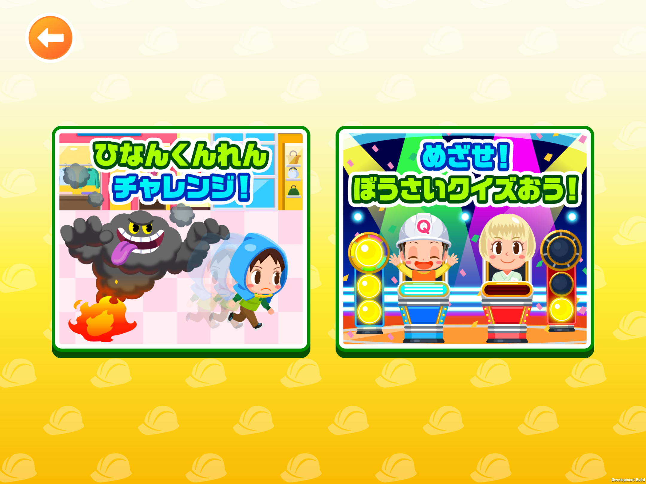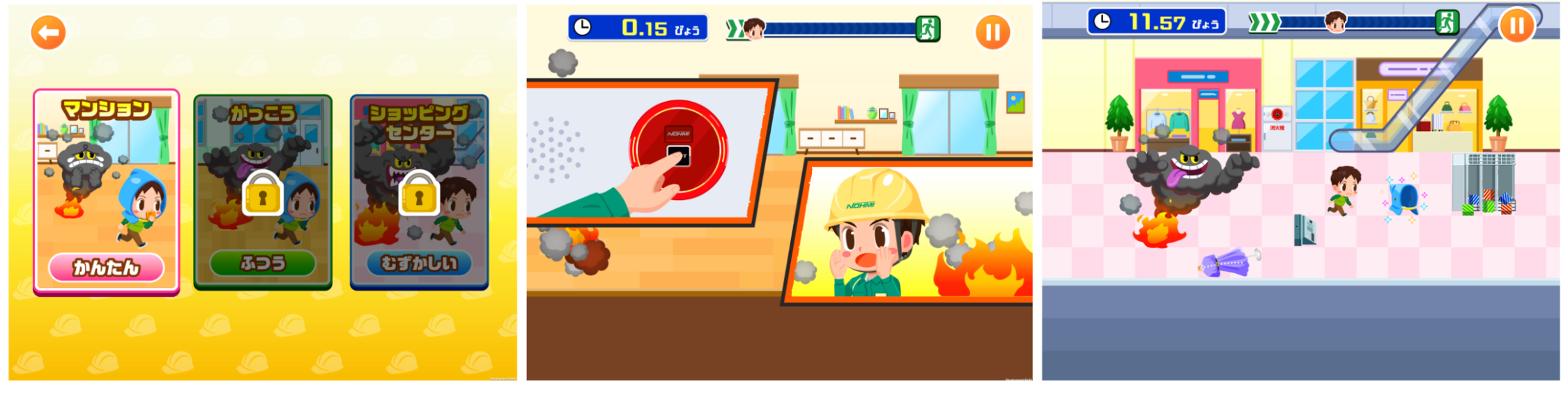 火災が発生した建物から避難するゲームです。背後から追いかけてくる煙の敵キャラクターに追いつかれないよう避難口を目指します。避難中に登場する瓦礫などの障害物に触れると歩くスピードが遅くなりますが、防災頭巾などのお助けアイテムに触れるとスピードが増すなど、様々なアイテムを使いながら避難します。「マンション」「がっこう」「ショッピングセンター」の全3ステージで構成され、子ども達になじみのある建物からどのように避難するか擬似訓練ができます。