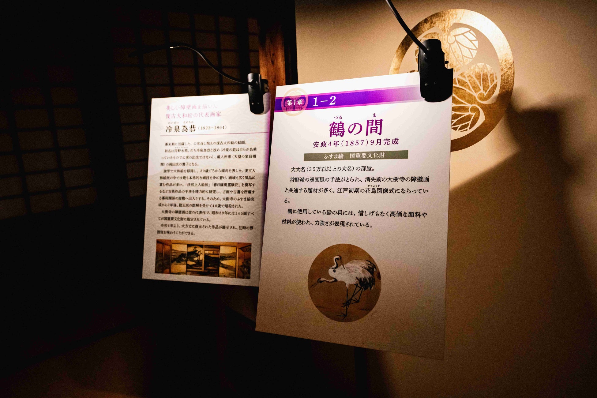 1475年(文明7年)に松平家の菩提寺として創建された大樹寺は1855年(安政2年)の火災により、主要建物が全焼し、以前の障壁画もろとも燃えてしまいました。1856年(安政3年)規模を少し小さくして再建され、その翌年冷泉為恭によって総数140面以上の膨大な障壁画が描きあげられたのです。鉄線之間、次に続く牡丹之間、鶴之間は火災以前の大方丈の障壁画と同じテーマを用い、伝統的な狩野派の漢画様式で描かれ、上段之間、下段之間はやまと絵様式で描かれています。 冷泉為恭は幕末に活躍した復古大和絵の絵師ですが、漢画系の狩野派に生まれながら、古い絵画の模写研究を行い、ほぼ独学でやまと絵を学習したと伝えられています。漢画とは、中国の宋元(そうげん)画様式に倣った日本の水墨画のことで、狩野派はその様式を代表する絵師集団です。狩野派は、織田信長、豊臣秀吉などに絵師として仕え、江戸時代には徳川幕府の御用絵師を勤めました。対して、やまと絵とは、平安時代から続く日本の伝統的な絵画で、華麗な色彩や装飾性、四季の自然への感興が特徴です。為恭は、その王朝時代の雅なやまと絵を、幕末に蘇らせようとしました。